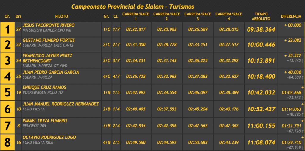 Tacoronte y Sáez no tuvieron grandes problemas para vencer en las cuatro magas, siempre con rentas amplias, ‘relajándose’ solo en la última, lo que les valió para marcar un crono de 9:38.364 superando en 22.082 a los segundos clasificados, Gustavo Fumero y José Andrés Vargas (Subaru Impreza Spec).
