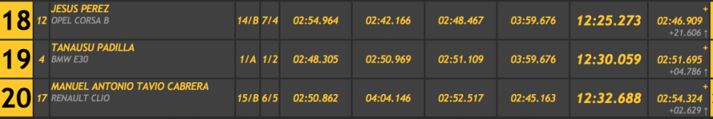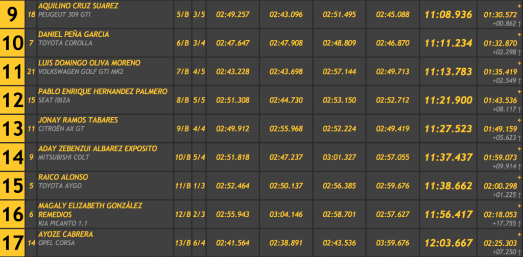 Terceros finalizaron Francisco Javier Pérez y Álvaro Ezequiel Pérez (Subaru Impreza GT 4WD), a 35.527 de la cabeza, a 13.445 del segundo lugar y superando en 4.509 Juan Pedro García y Pedro Manuel Vera (Subaru Impreza), cuartos. Gran quinto lugar para Enrique Cruz y Mario Quintero en el pequeño Volkswagen Polo TDI.