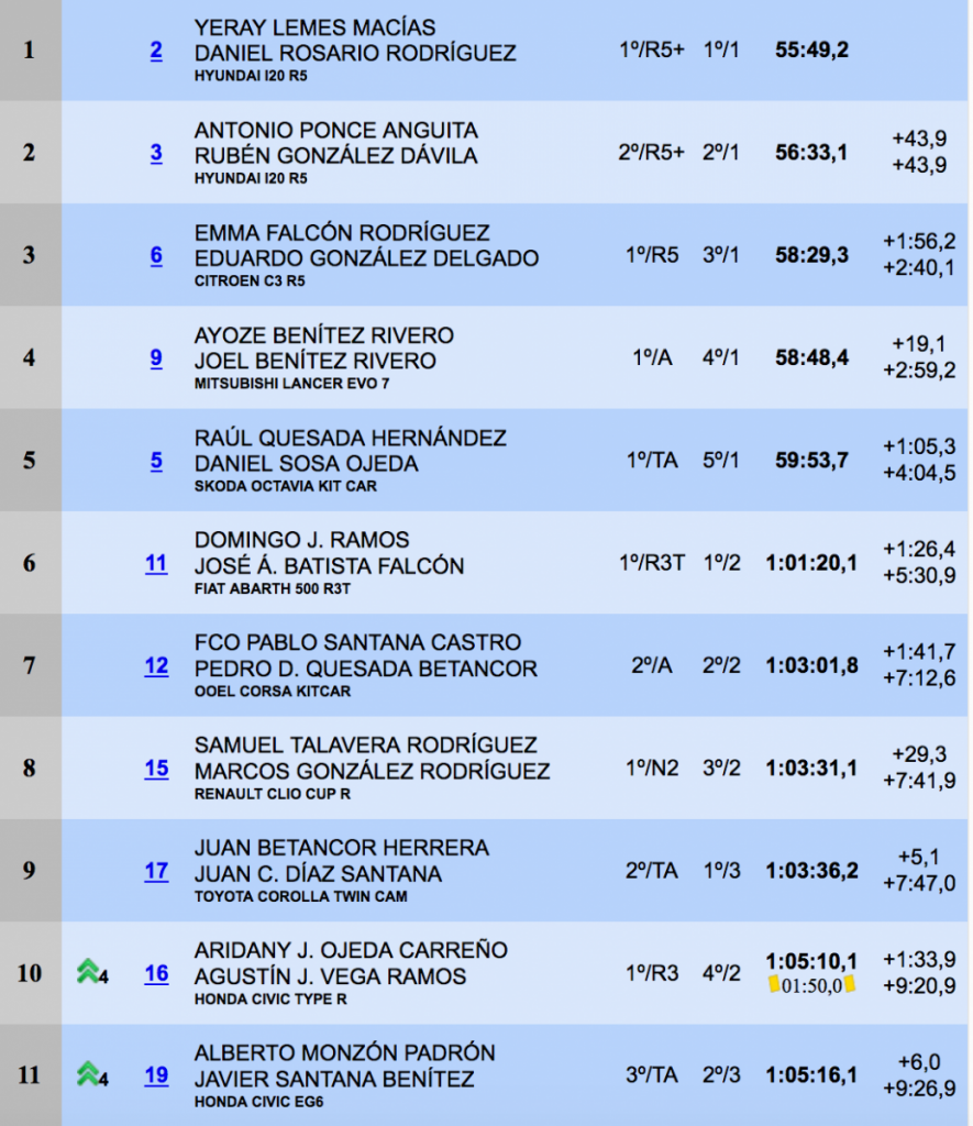 De esta manera, por primera vez en un rallye local se ocupaba un podio al completo con vehículos del tipo R5. Y además del mismo equipo, Fuertwagen Motorsport, dirigido por José Pérez.