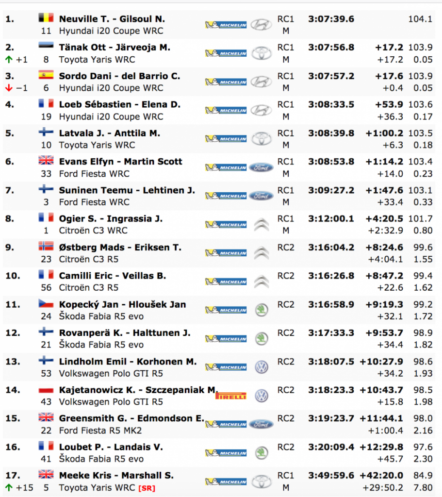 Neuville ganó la prueba de superficie mixta de tres días por 17,2 segundos en un Hyundai i20 con su compañero de equipo Dani Sordo tercero, 0,4 segundos por detrás en un Toyota Yaris.