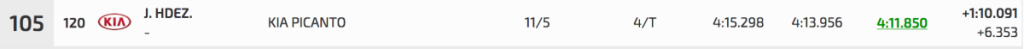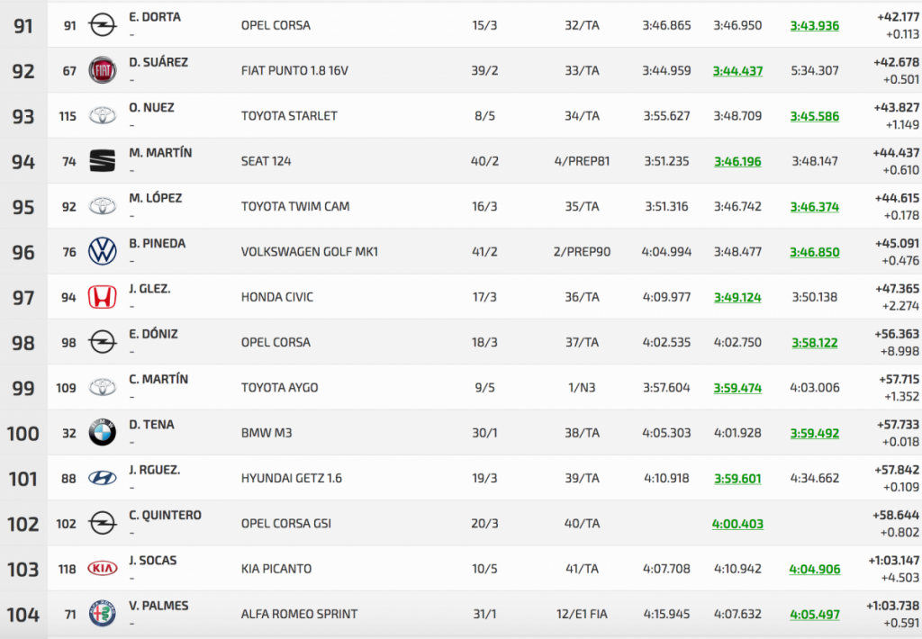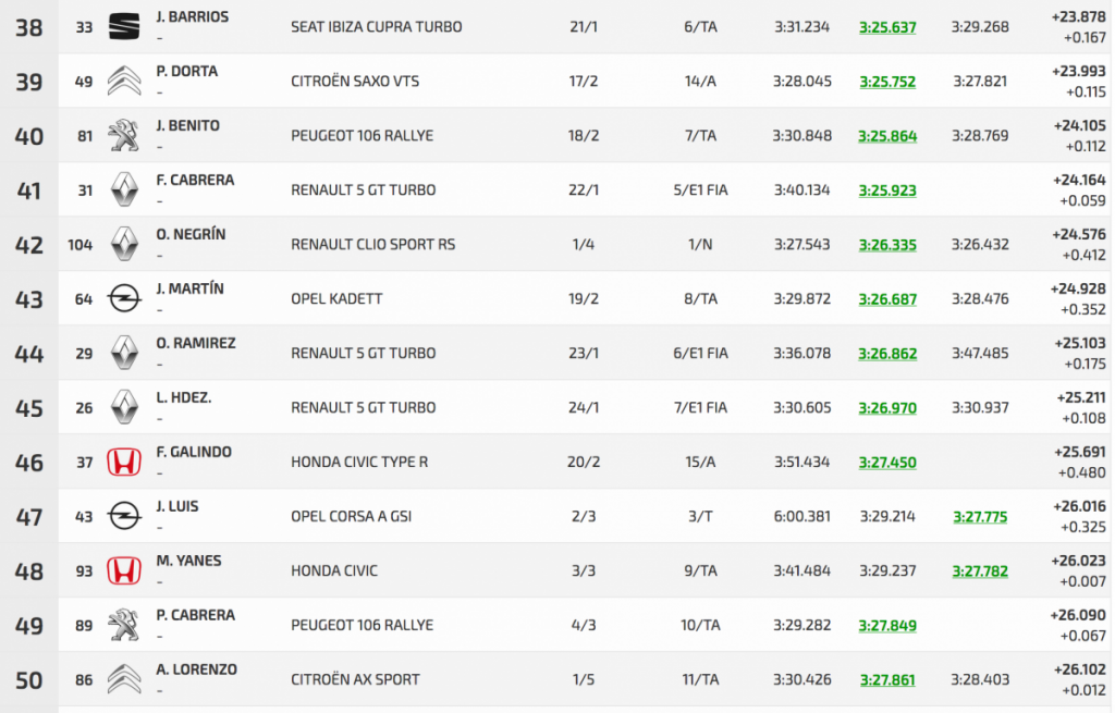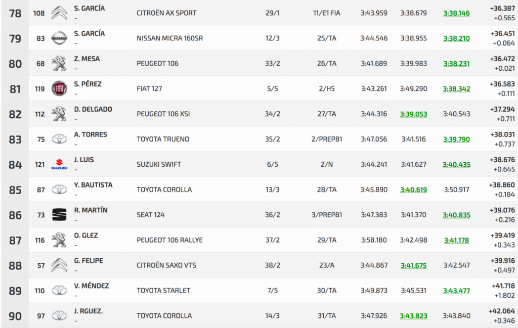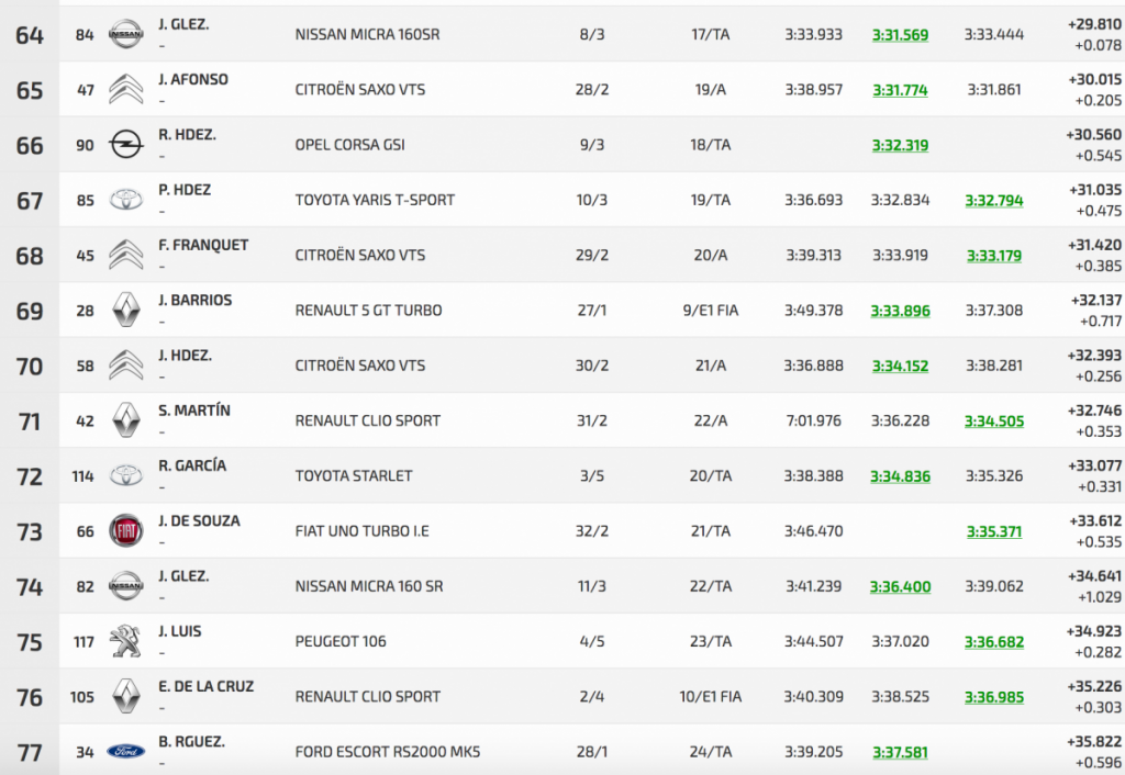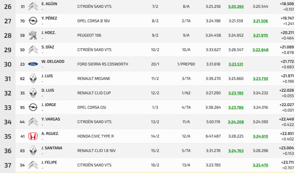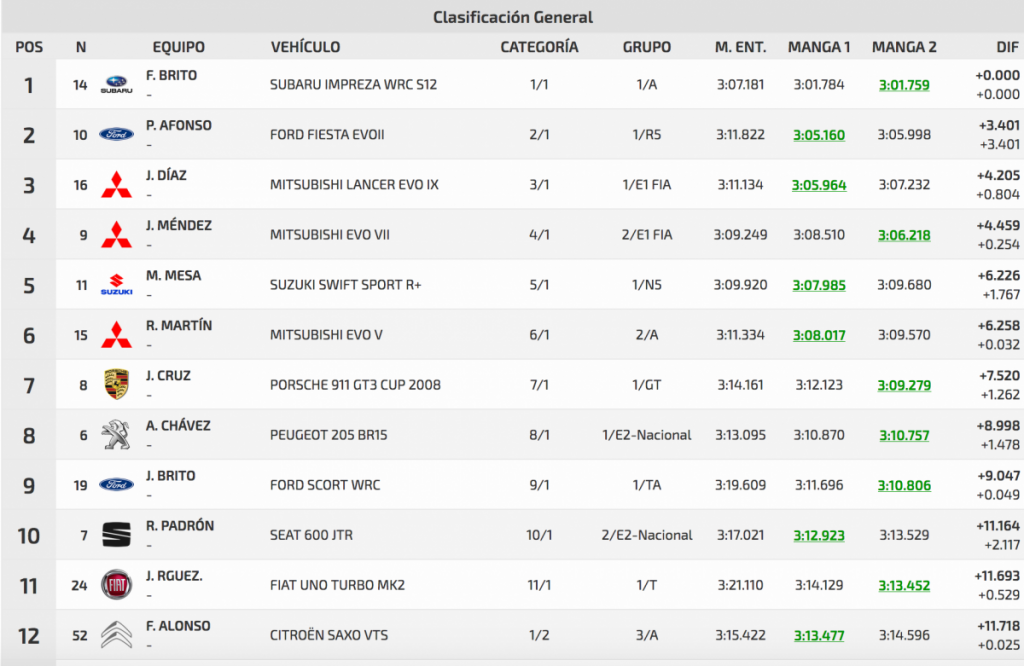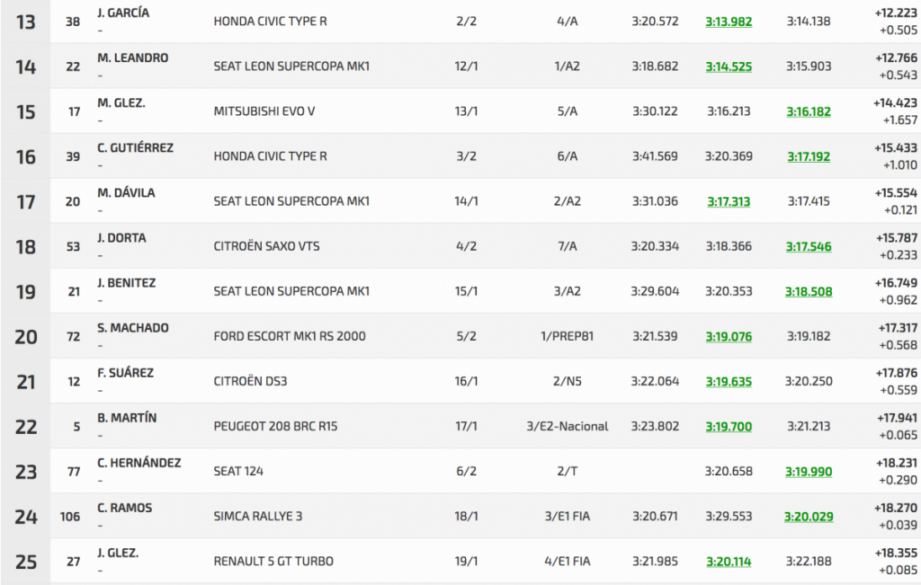Entre los turismos Félix casi calca sus dos registros oficiales, con un 3:01.784 inicial por un 3:01.759 final, logrando superar en 3.401 a Pedro Javier Afonso (Ford Fiesta R5), segundo, que superó a Pedro J. Díaz (Mitsubishi Lancer Evo IX), en solo 0.804.