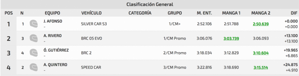Javier realizó dos buenos cronos, mejorándolos desde la ascensión de entrenos: 2:52.106, 2:51.788 y 2:50.639. Todo esos tiempos le habría valido para vencer entre las barquetas, puesto que el segundo lugar fue a parar a manos de Adán Rivero (BRC 05 Evo), que se quedaba a 13.100, siendo tercero Óscar Gutiérrez (BRC 2), a 19.965 de la cabeza y a 6.865 del segundos lugar.