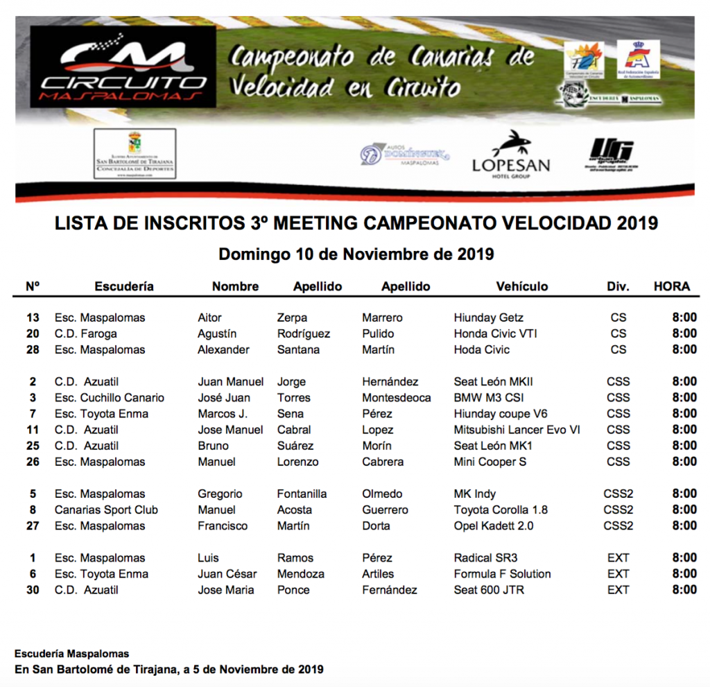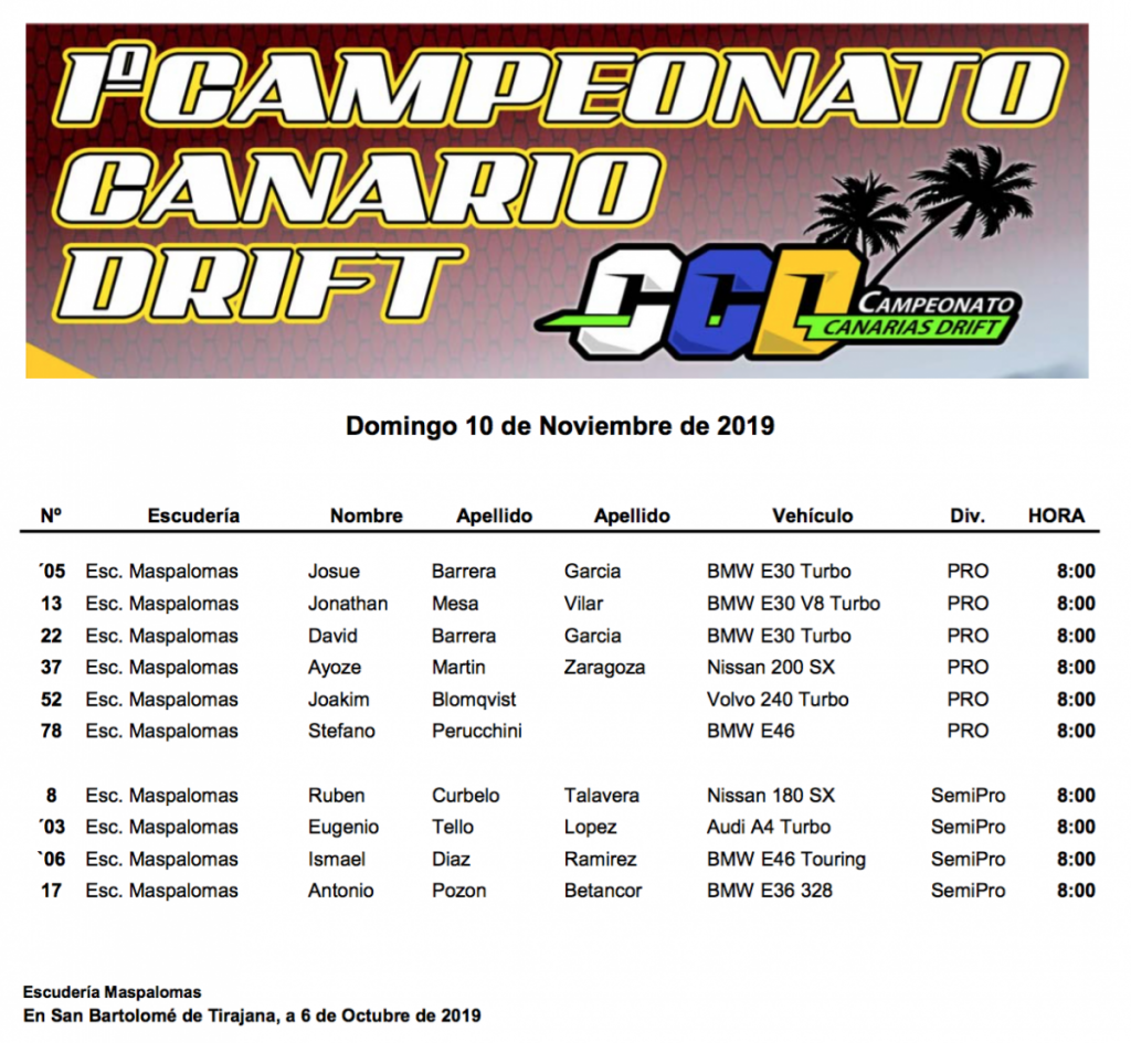 La lista de participantes de la tercera reunión del Campeonato de Canarias de Drif y del Campeonato de Canarias de Velocidad, que se disputarán este domingo en el Circuito de Maspalomas, tiene un total de 25 pilotos y vehículos: 15 en la modalidad de Velocidad y 10 en la de Drifting.