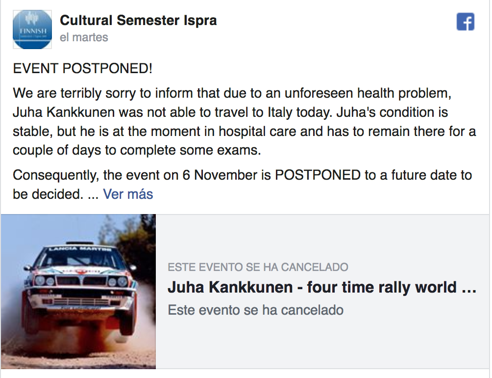 Sin embargo, el organizador del evento anunció en su página de Facebook que Kankkunen no podría asistir debido a repentinos y graves problemas