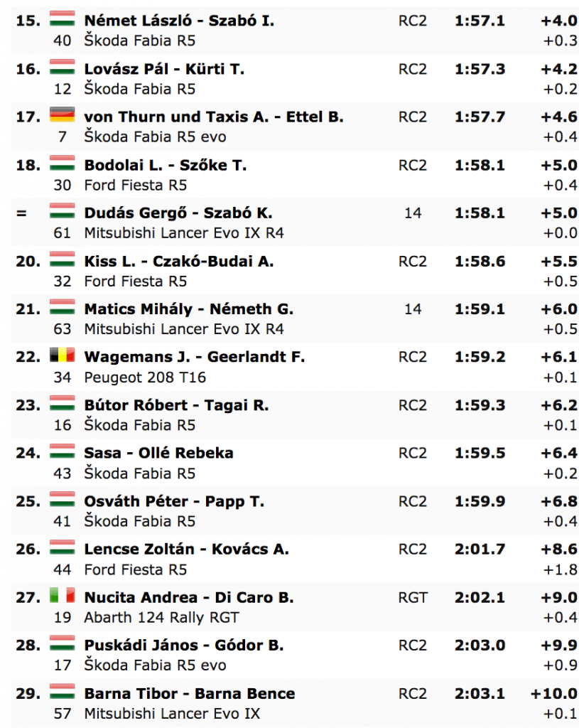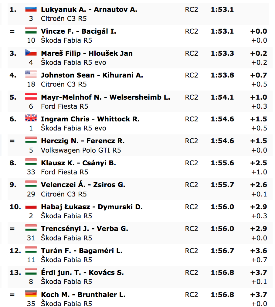 Lukyanuk (Saintéloc Junior Team), el campeón defensor del ERC, y Vincze, del Korda Racing Team, que logró su primer título húngaro el mes pasado, establecieron exactamente el mismo tiempo de 1:53.1 en la prueba celebrada en el Rabócsiring, de 2.400 metros, por lo que ambos comparten el liderato del rally, solo dos décimas de segundo por delante de Filip Mareš, del equipo de rallys checo ACCR ŠKODA, campeón del ERC1 Junior.
