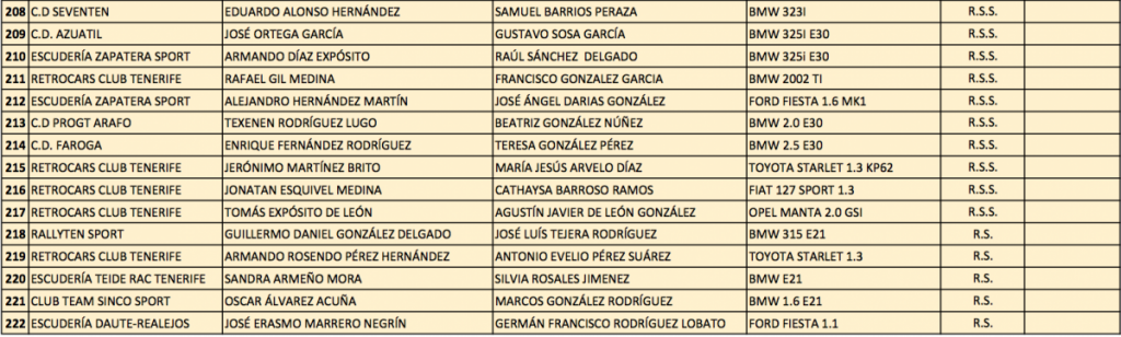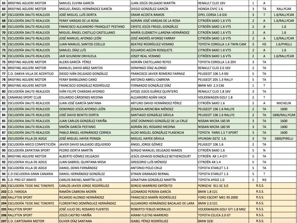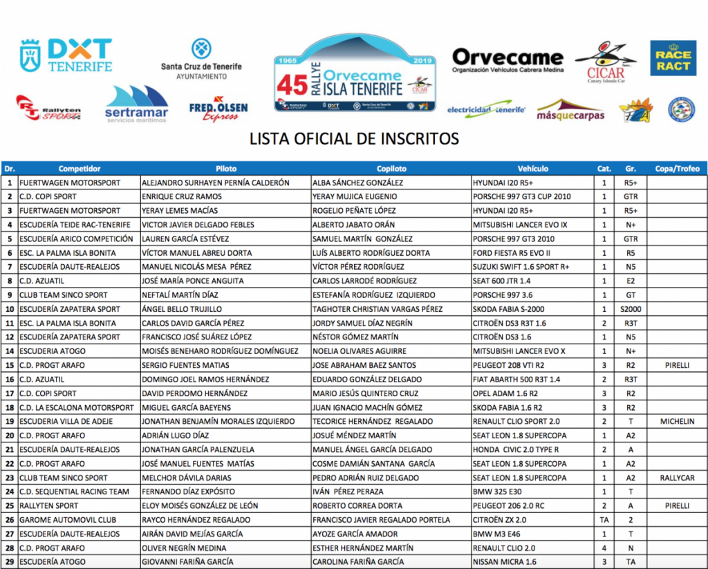 El Club Rallyten Sport, entidad organizadora de la prueba, ha publicado la lista oficial de inscritos en su web oficial siguiendo el reglamento particular de la prueba. Así, serán finalmente 116 de equipos los participantes, 21 en regularidad sport y el resto, 95 en velocidad. Se trata de una de las pruebas más importantes del calendario regional de Rallyes de Asfalto de Canarias que se celebrará los próximos 15-16 y 17 de noviembre.