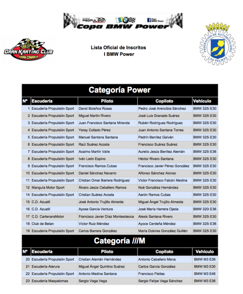 Publicamos la lista Oficial de Inscritos de la I BMW Power, evento final de temporada que se celebrará en la tarde de este sábado en el Gran Karting Club de Gran Canaria.