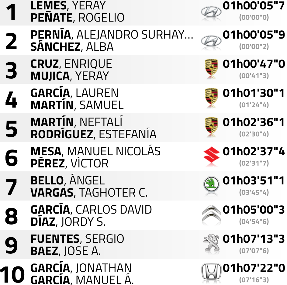 De esta manera Lemes y Peñate pasan a liderar la general con 0.2 de ventaja y tendrán dos tramos en la mañana de este domingo para poder certificar su triunfo. Además, tendrán que ser fuertes en la primera especial de la jornada, Los Campitos (8,400 metros), que será TC Plus, con lo que son unos puntos añadidos claves de cara a su lucha por el título que se tendrá que decidir en su tierra, en el Rally Isla de Lanzarote.