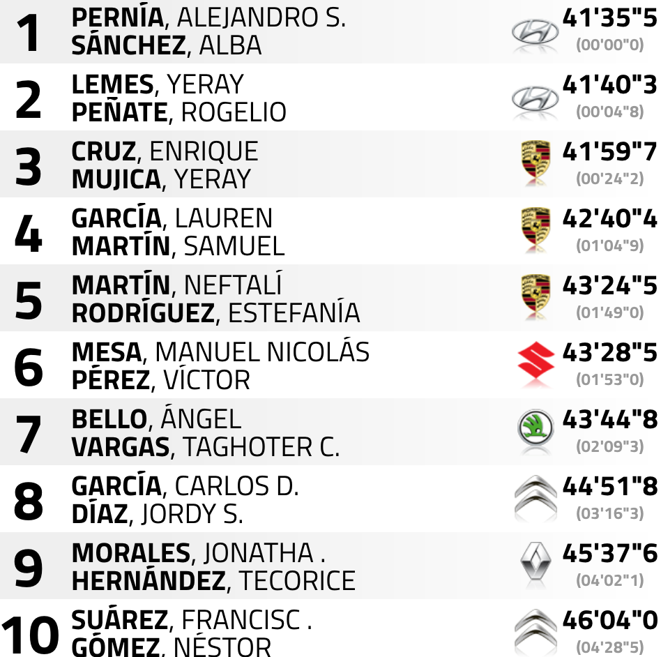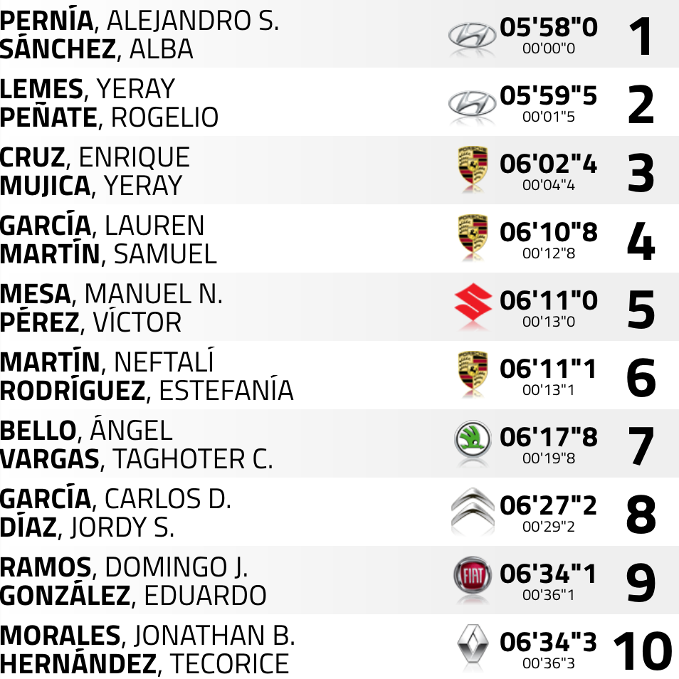 Sextos continúan Manolo Mesa – Víctor Pérez (Suzuki Swift 1.6 Sport), seguidos de Ángel Bello y Taghoter Vargas (Skoda Fabia S200), séptimos; de Carlos David García y Jordi Díaz (Citroën DS3 R3T), octavos; de Jonathan Morales y Teco Hernández (Renault Clio); de Fran Suárez y Néstor Gómez (Citroën DS3 N5); y Sergio Fuentes y Abraham Báez (Peugeot 208 R2).