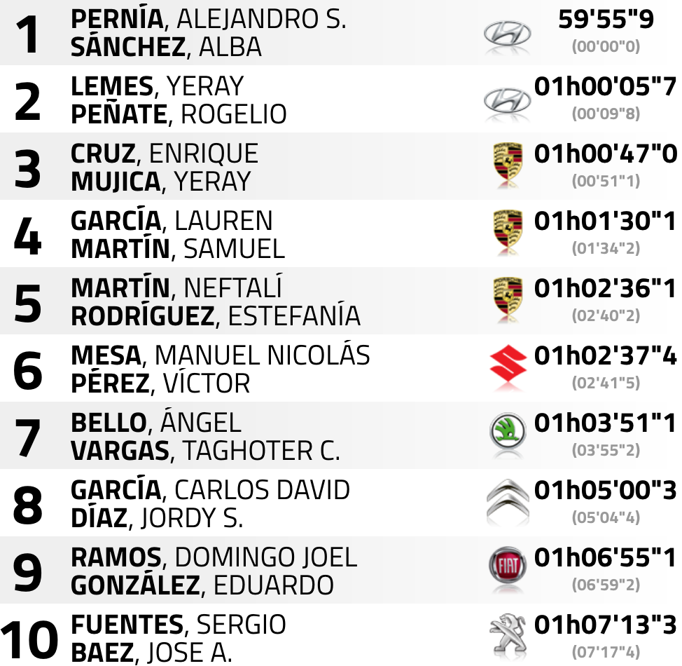 De esta manera el primer puesto es para Pernía y Sánchez con una renta de 9.8 sobre Lemes y Peñate, por lo que todo queda por decidirse en los dos tramos cronometrados de la mañana de la jornada de este domingo. Si todo sigue de la misma manera, Pernía dejará pasar, de una manera y otra a Lemes, y así cuadrar la jugada del equipo, que metería al cántabro entre Lemes y el tinerfeño Enrique Cruz y al grancanario Yeray Mujica (Porsche 997 GT3) en su lucha por el título del Campeonato de Canarias de Rallys, pero para que eso se produzca todavía queda tela por cortar porque en dos tramos pueden pasar muchas cosas.