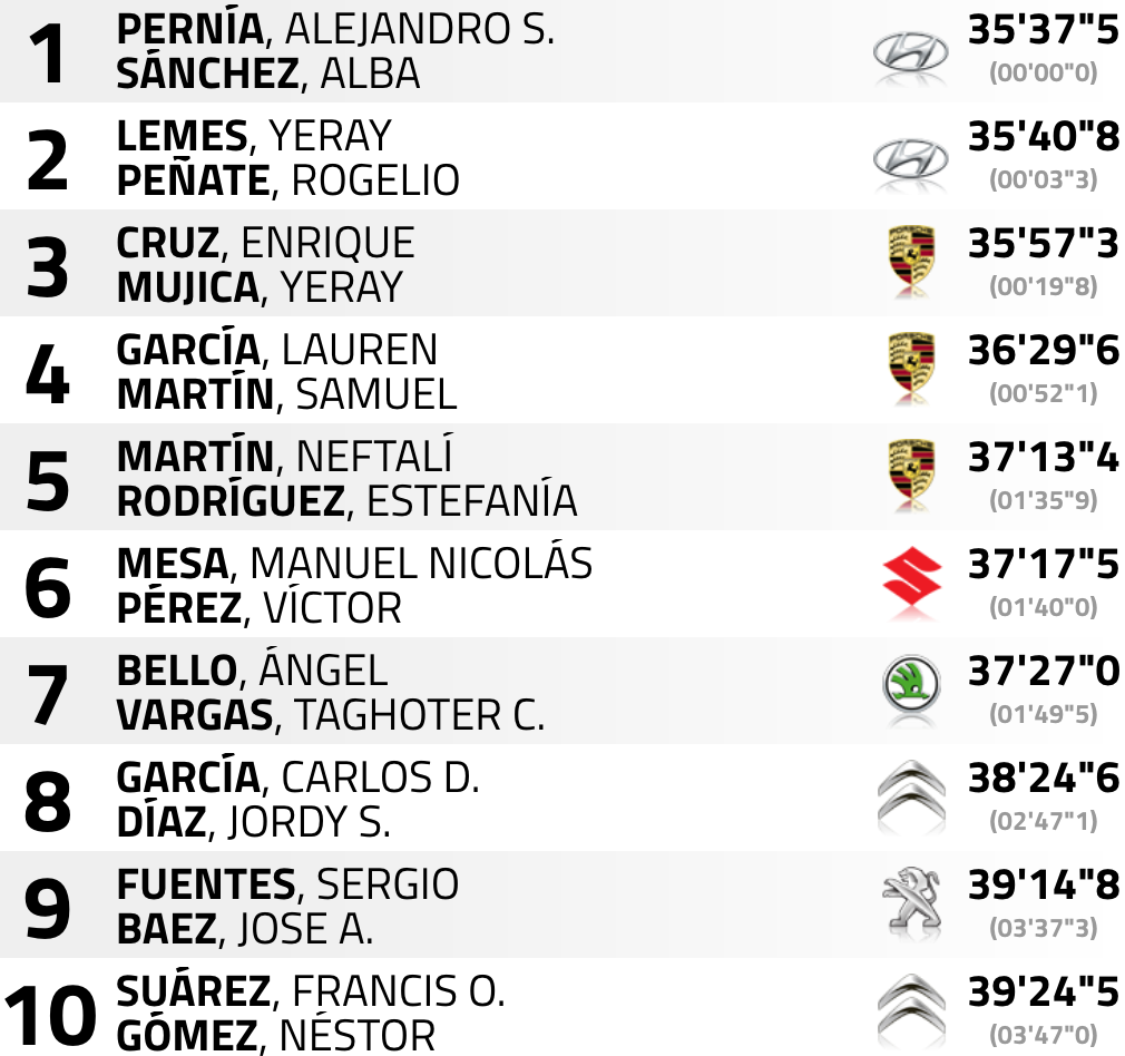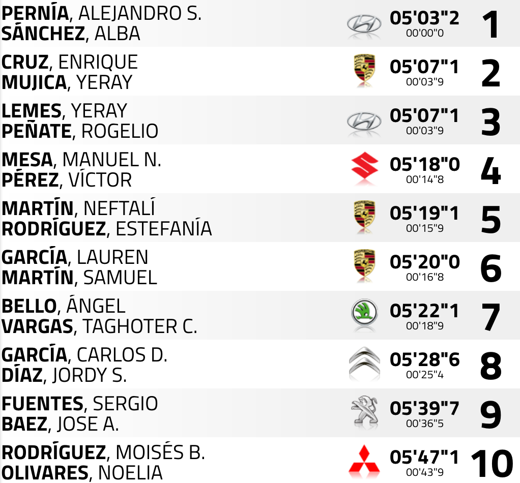 Segunda pasada por la especial de ‘Porís de Abona’ (8,08 km) y nuevamente el cántabro Surhayen Pernía y la leonesa Alba Sánchez (Hyundai I20 R5) eran los más rápidos en la crono, superando al tinerfeño Enrique Cruz y al grancanario Yeray Mujica (Porsche 997 GT3) en 3″9, misma distancia con los anteriores líderes, el lanzaroteño Yeray Lemes y el grancanario Rogelio Peñate, (Hyundai I20 R5+), que pasan a la segunda plaza con una desventaja ahora de 3.3 respecto a sus compañeros de Hyundai Canarias Surhayen y Alba.