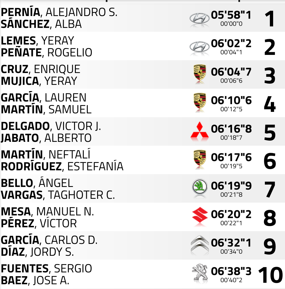 Terceros de la especial y de la general son Enrique Cruz y Yeray Mujica (Porsche 997 GT3), que en el tramo marcaban un 6’04″7, quedándose a 6″6 de Pernía y a 2.5 de Lemes, mientras que en la general está a 10.4 de Lemes.
