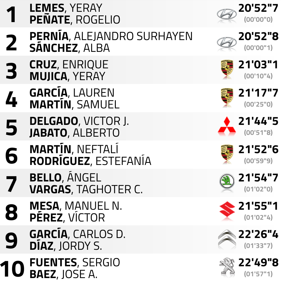 Pernía y Sánchez invirtieron un tiempo de 5’58″1 en recorrer los 9.340 metros de la especial, superando a sus compañeros de equipo de Hyundai Canarias, el lanzaroteño Yeray Lemes y el grancanario Rogelio Peñate, (Hyundai I20 R5+), en 4″1, quedando la diferencia a favor de Lemes y Peñate en solo 0.1 tras la finalización del primer bucle.
