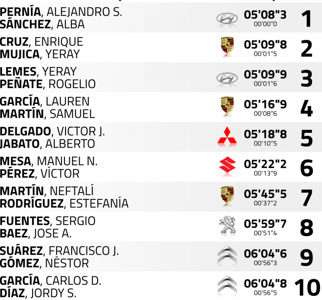 Hasta la sexta plaza ascienden Manolo Mesa y Víctor Pérez (Suzuki Swift 1.6 Sport), seguido de Neftalí Martín y Estefanía Rodríguez (Porsche 997 GT3) y Ángel Bello y Taghoter Vargas (Skoda Fabia S200), que pierden dos plazas al bajar del sexto al octavo lugar.