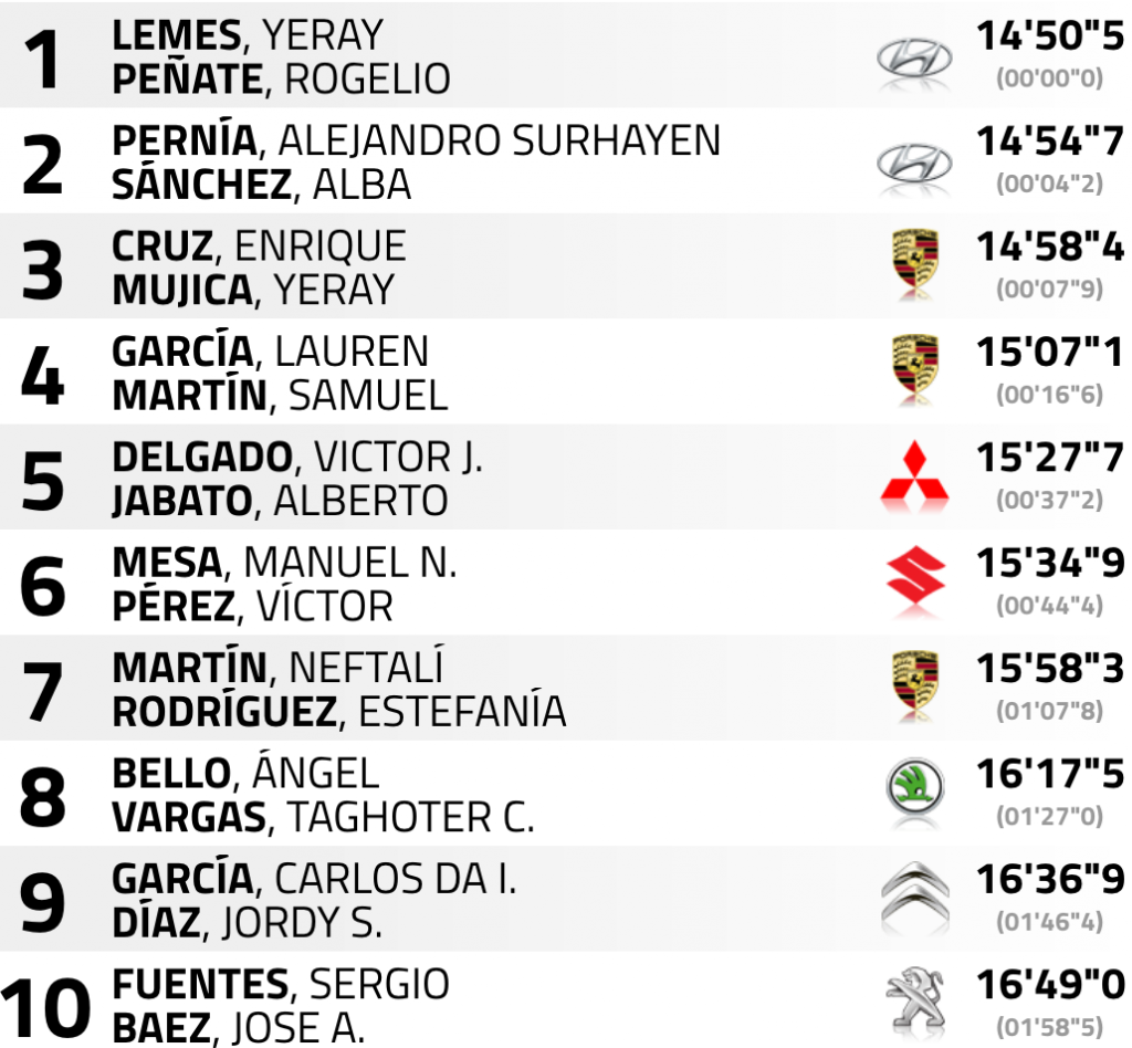 Lemes y Peñate siguen líderes, con 4.2 de distancia con sus compañeros de Hyundai Canarias, Pernía y Sánchez, siendo terceros, a 7.9, Cruz y Mujica.