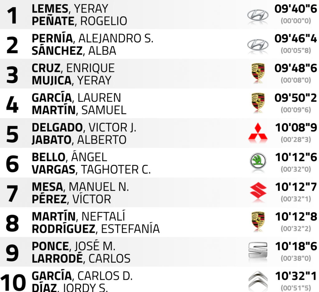 La sexta plaza es para Ángel Bello y Taghoter Vargas (Skoda Fabia S200), sólo una décima mejor que Manolo Mesa y Víctor Pérez (Suzuki Swift 1.6 Sport), séptimos. Hasta la octava posición se fueron Neftalí Martín y Estefanía Rodríguez (Porsche 997 GT3). En la novena plaza se sitúan José María Ponce y Carlos Larrodé con su Seat 600 JTR, cerrando las diez primera posiciones Carlos David García y Jordi Díaz en su estreno con el Citroën DS3 R3T.