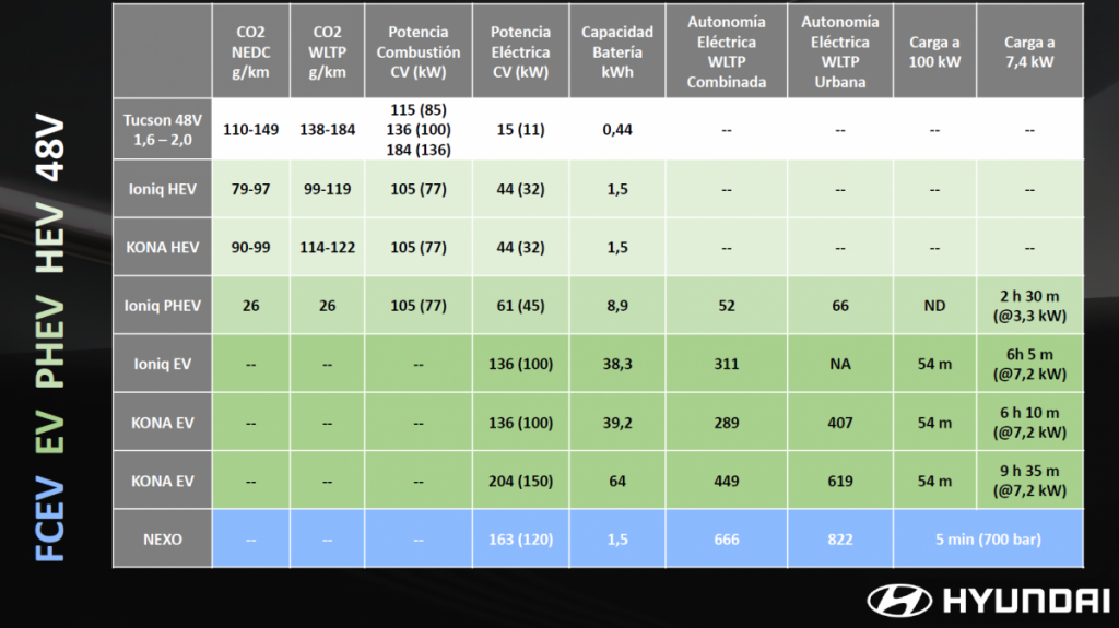 La gama híbrida sube un escalón con los KONA e Ioniq HEV, que alcanzan niveles superiores de eficiencia energética gracias a su hibridación de alto voltaje. Su cambio DCT añade reacciones muy vivas, poco frecuentes en otros híbridos. El IONIQ PHEV (híbrido enchufable) requiere una mención especial, ya que añade una batería de mayor tamaño que puede cargarse a la red, proporcionando más de 50 km de autonomía, y superando los 60 en entorno urbano. Esto le permite comportarse como un vehículo eléctrico en los desplazamientos diarios, y por su parte el motor de gasolina garantiza una movilidad híbrida sin límites cuando no sea posible cargarlo o cuando afrontemos largos viajes.