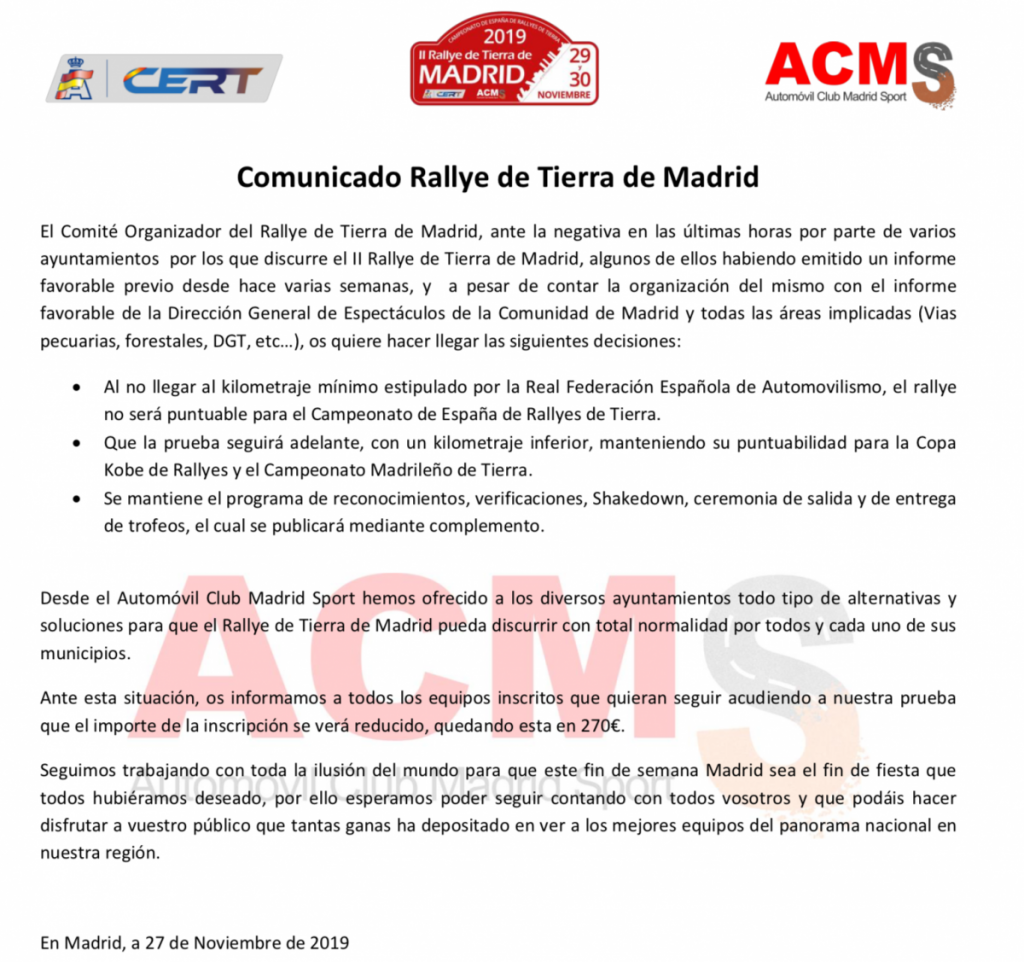 El Comité Organizador del Rallye de Tierra de Madrid ha informado que no podrá ser puntuable para el Campeonato de España de Rallys de Tierra, por lo que no será la última cita del CERT, que será entonces el Isla de Los Volcanes, celebrado en la isla de Lanzarote.
