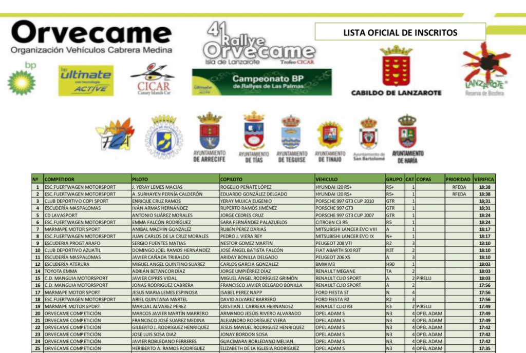 El 41 Rallye Orvecame Isla de Lanzarote es posible gracias a ORVECAME, Cicar, Cabildo de Lanzarote, los ayuntamientos de Arrecife, Tías, Teguise, Tinajo, San Bartolomé y Haría, además de BP, Fred. Olsen Express, Hamburguesería Cuca y Rotulaciones Pintadera.