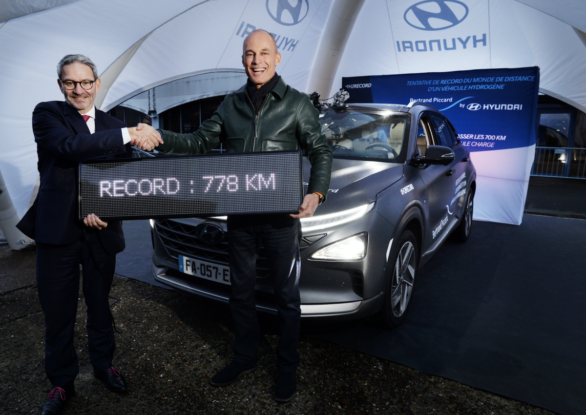 El aeronauta francés y presidente de la Fundación Solar Impulse Bertrand Piccard ha batido el récord mundial de la distancia más larga recorrida en un vehículo propulsado por hidrógeno con un solo reabastecimiento de combustible. Conduciendo un Hyundai Nexo, Piccard salió de la estación de hidrógeno de FaHyence en Sarreguemines el lunes 25 de noviembre, lugar elegido por el compromiso de la Gran Región del Este con la movilidad responsable, y llegó al día siguiente al Museo del Aire y del Espacio en Le Bourget, a una distancia de 778 km. Nunca antes un coche de producción alimentado por una pila de combustible de hidrógeno había recorrido tantos kilómetros con una sola carga.