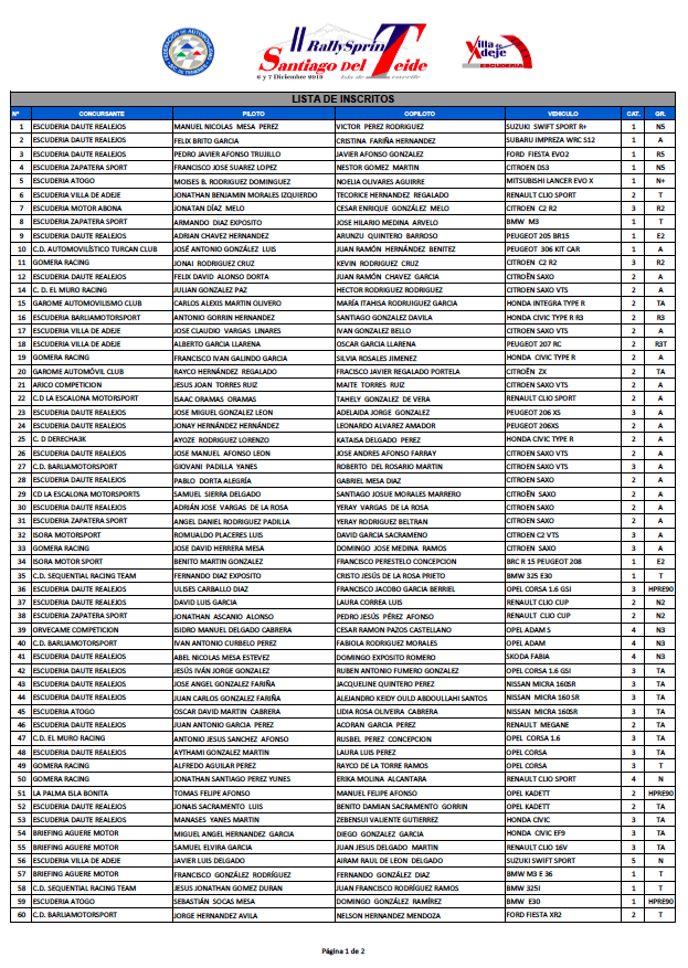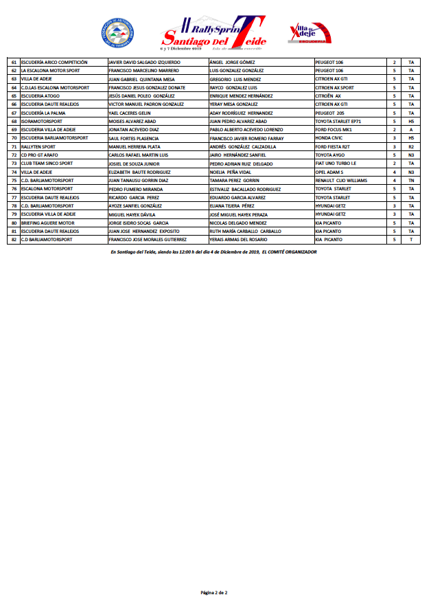 Finalmente serán 81 los equipos que conforman la lista de inscritos de la segunda edición del Rallysprint Santiago del Teide que se disputa este sábado en el suroeste es la isla de Tenerife y que intentarán tomar el relevo del ganador de la primera edición, el mundialista Yeray Lemes, proclamado Campeón de Canarias el pasado fin de semana.
