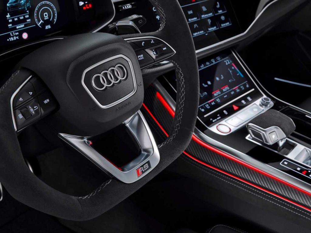 El conductor puede influir de manera precisa en el carácter del RS Q8 mediante el sistema de conducción dinámica Audi drive select. Existen ocho modos a elegir: comfort, auto, dynamic, efficiency, allroad, offroad y los dos modos RS individualmente configurables (RS1 y RS2), que se pueden activar directamente mediante el botón “RS-Mode” situado en el volante. El Audi drive select gestiona elementos como el motor, la transmisión, la dirección, la suspensión, el sonido del escape o la climatización.