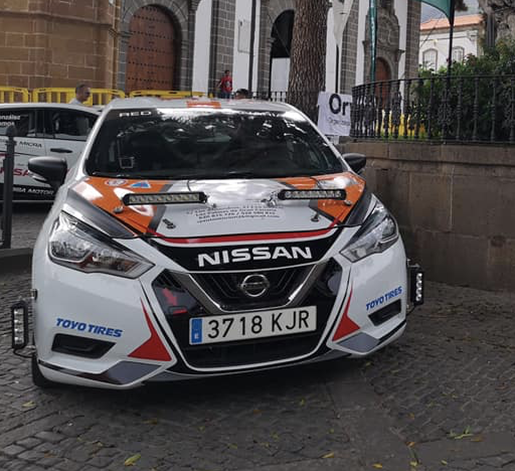 El joven piloto grancanario Cristian Alfonso ofrece su Nissan Micra como la plataforma publicitaria adecuada para posibles interesados.