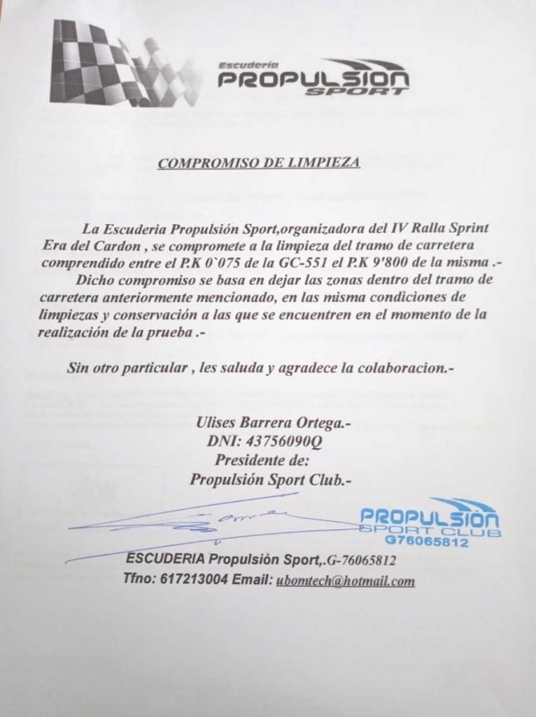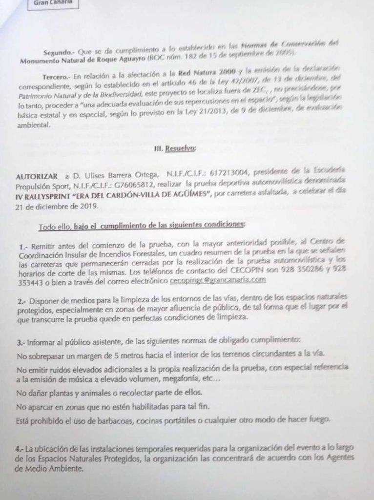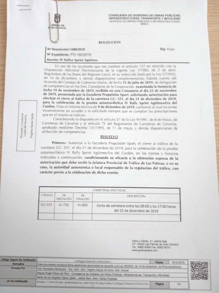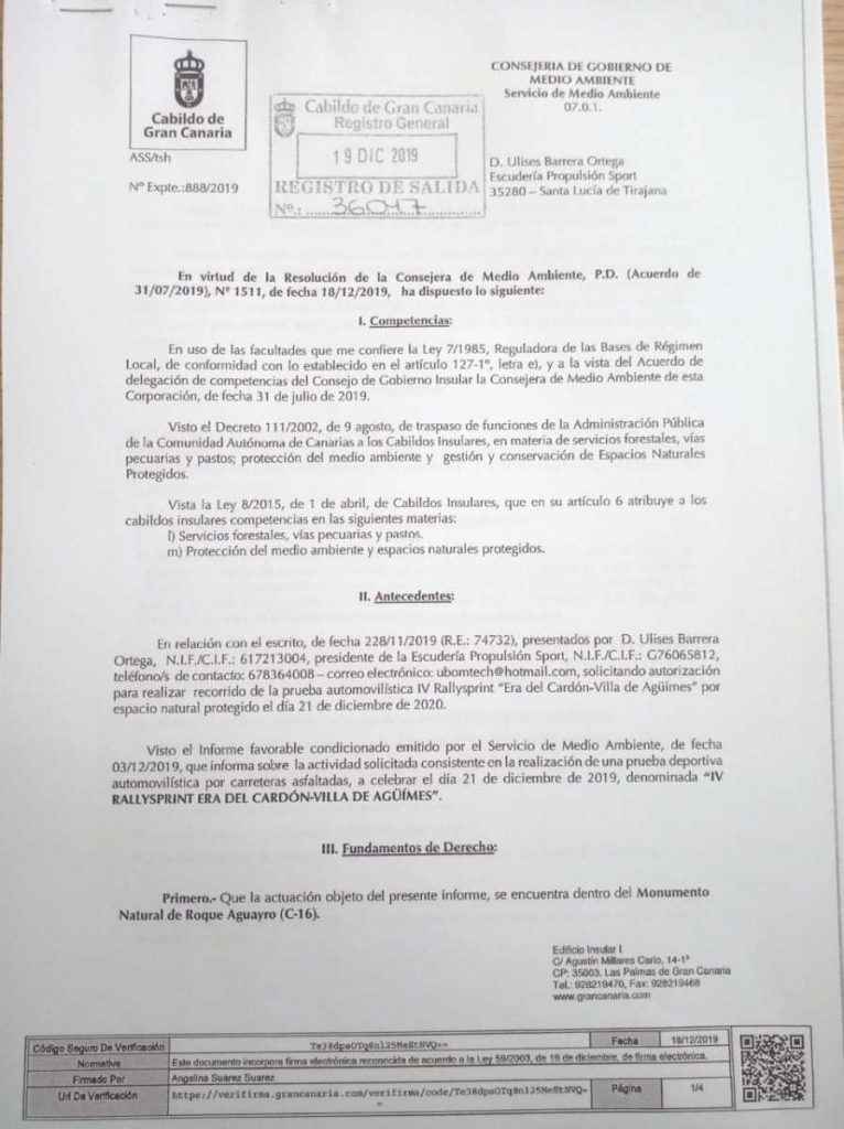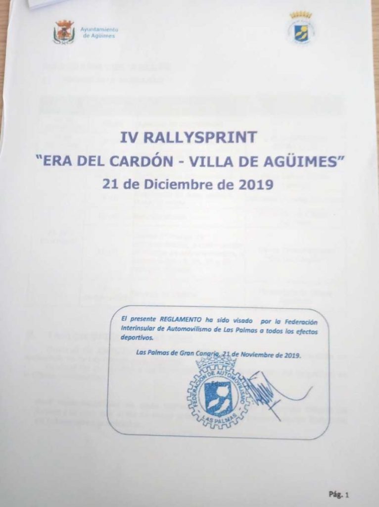 Le damos entrada a nueva petición en registro del Ayuntamiento de Agüimes a día 22 de Noviembre: con nuevo Plan de Seguridad, reglamento con sello y firma de la FALP, se le aporta seguro de la prueba, se le entrega un compromiso de limpieza que nos exige el Cabildo, se pagan las tasas al Cabildo y se aporta al expediente municipal, autorización para el cierre de carretera de Cabildo de Gran Canaria (resolución:1080/2019-Expediente PD-180/2019) y autorización de Consejería de Medio Ambiente, también del Cabildo de Gran Canaria (Expediente 888/2019 ), alguna documentación más que seguro nos pidieron y entregamos en tiempo y forma.