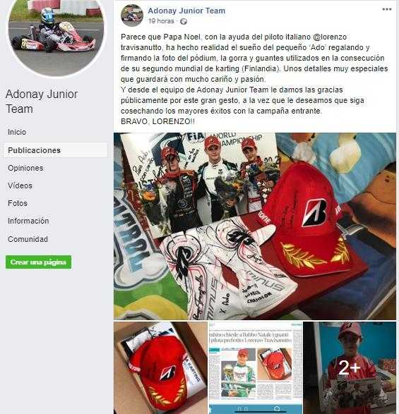 Parece que Papa Noel, con la ayuda del piloto italiano LORENZO TRAVISANUTTO, ha hecho realidad el sueño del pequeño ADONAY ‘ADO’ CRESPO GUERRA regalando y firmando la foto del pódium, la gorra y guantes utilizados en la consecución de su segundo mundial de karting (Finlandia). Unos detalles muy especiales que guardará con mucho cariño y pasión.