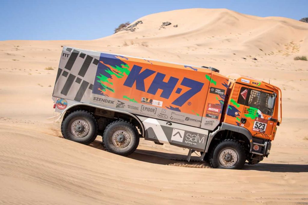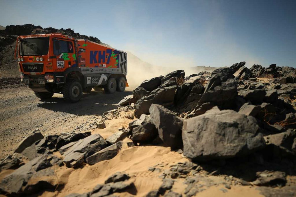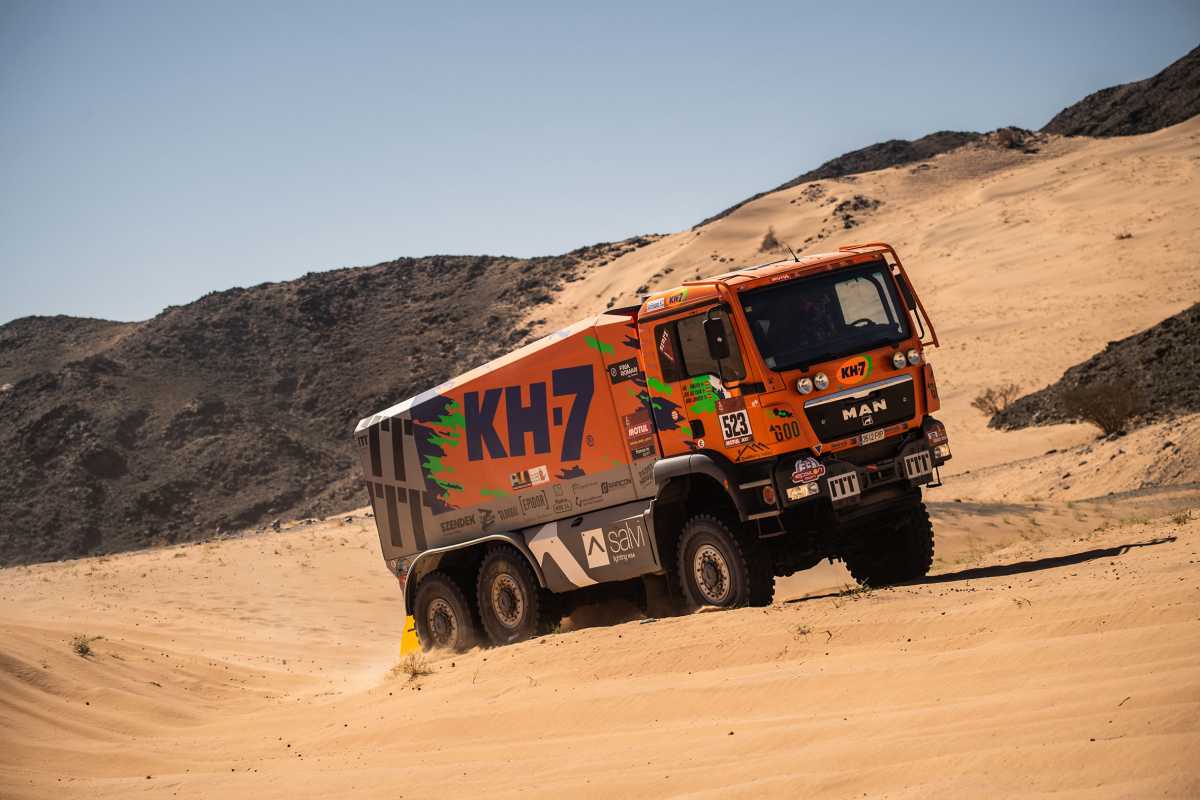 El KH-7 Epsilon Team ha completado con nota la primera especial del Dakar en Arabia Saudí, una exigente etapa de 752 kilómetros, entre Jeddah y Al Wajh, de lo cuales 319 correspondían a la especial cronometrada. El piloto Jordi Juvanteny y sus copilotos José Luis Criado y Xavi Domènech han registrado un tiempo de 5 horas, 32 minutos y 51 segundos, resultado que aúpa al veterano MAN 6×6 hasta la 24ª posición absoluta. “Ha ido todo muy bien y estamos muy satisfechos”, ha sido el balance unánime de la formación.