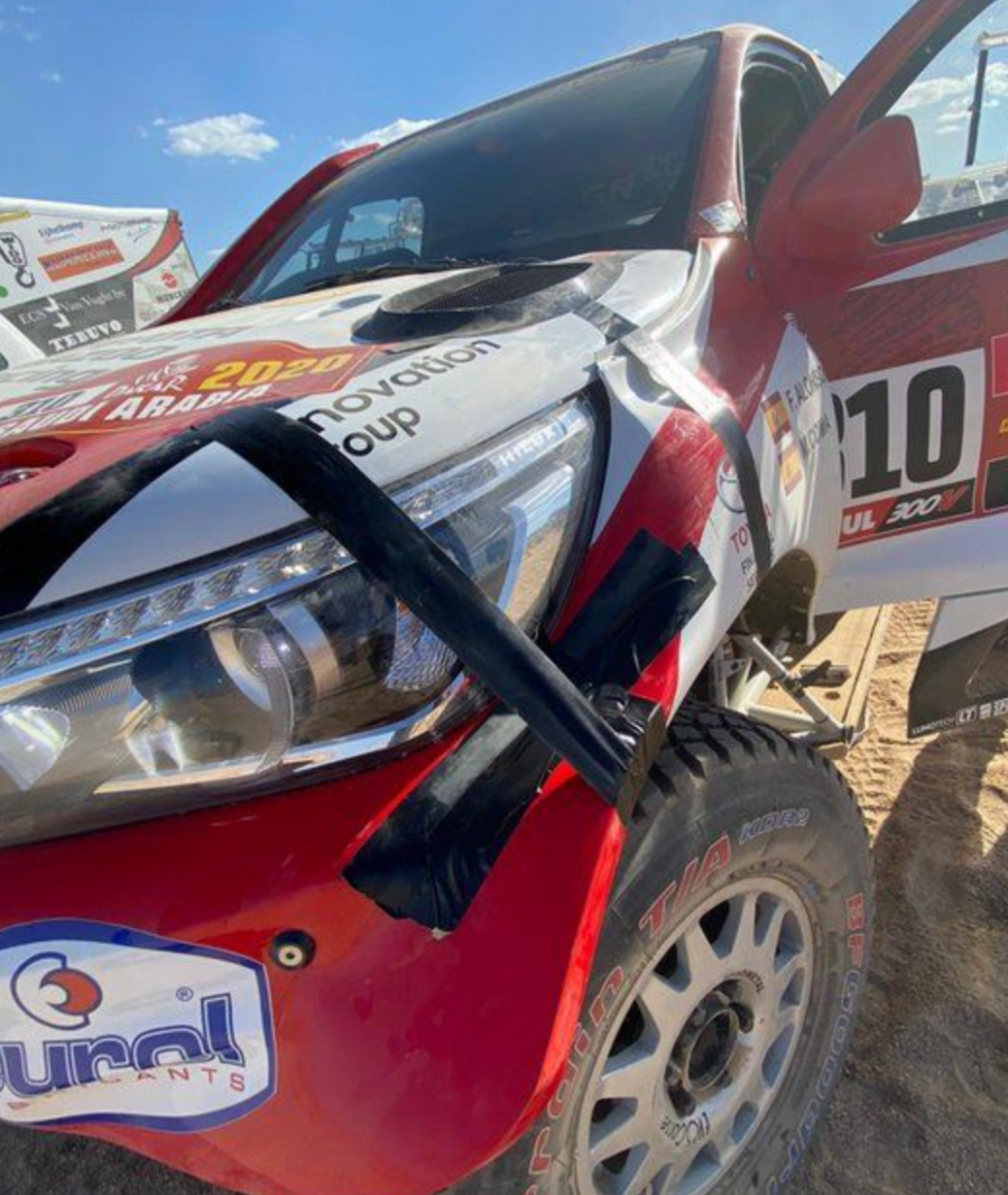 Los españoles Fernando Alonso y Marc Coma, del equipo Toyota Gazoo Racing, rodaban terceros del primer parcial en el kilómetro 52, cuartos en el kilómetro 104 y octavos en el 159, pero cuando estaban justo detrás del polvo de Erik Van Loon, justo en el kilómetro 160, algo desconocido les golpeó, dañándose seriamente la suspensión delantera de su Hilux al arrancar su rueda delantera izquierda y perdiendo dos horas y media.
