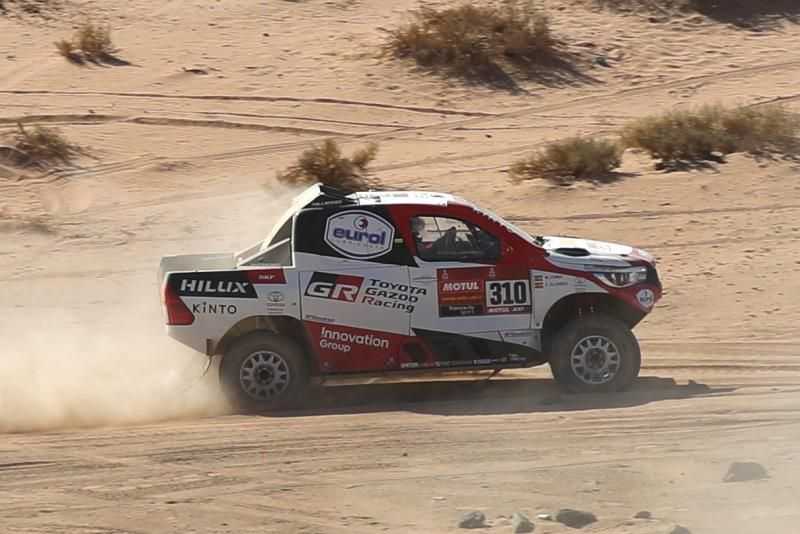 La peor parte de la dura etapa en los cañones secos y pedregosos que discurren entre las ciudades saudíes de Al Wajh y Neom se la llevó Fernando Alonso, que rompió su delantera izquierda al chocar contra una piedra y tardo más de dos horas en reparar el desperfecto.