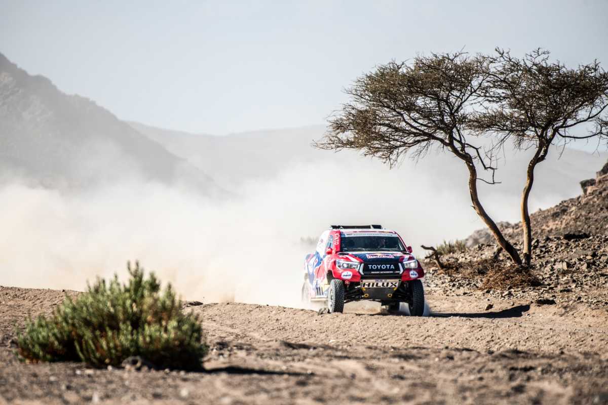 Mientras, Fernando Alonso y su copiloto Marc Coma comenzaron la segunda etapa del Dakar de su debut con el tercer tiempo más rápido en el primer control de paso y se mantuvieron entre los diez primeros hasta la mitad de la etapa. Sin embargo, una zanja oculta entre el polvo produjo un daño significativo en la suspensión delantera de su Toyota Hilux, con lo que Alonso y Coma perdieron finalmente 2 horas, 34 minutos y 38 segundos en meta tras tener que reparar su Hilux. A pesar de que ahora están en la posición 48 de la general, el dúo Alonso-Coma sigue siendo optimista sobre su primera aventura en el Dakar.