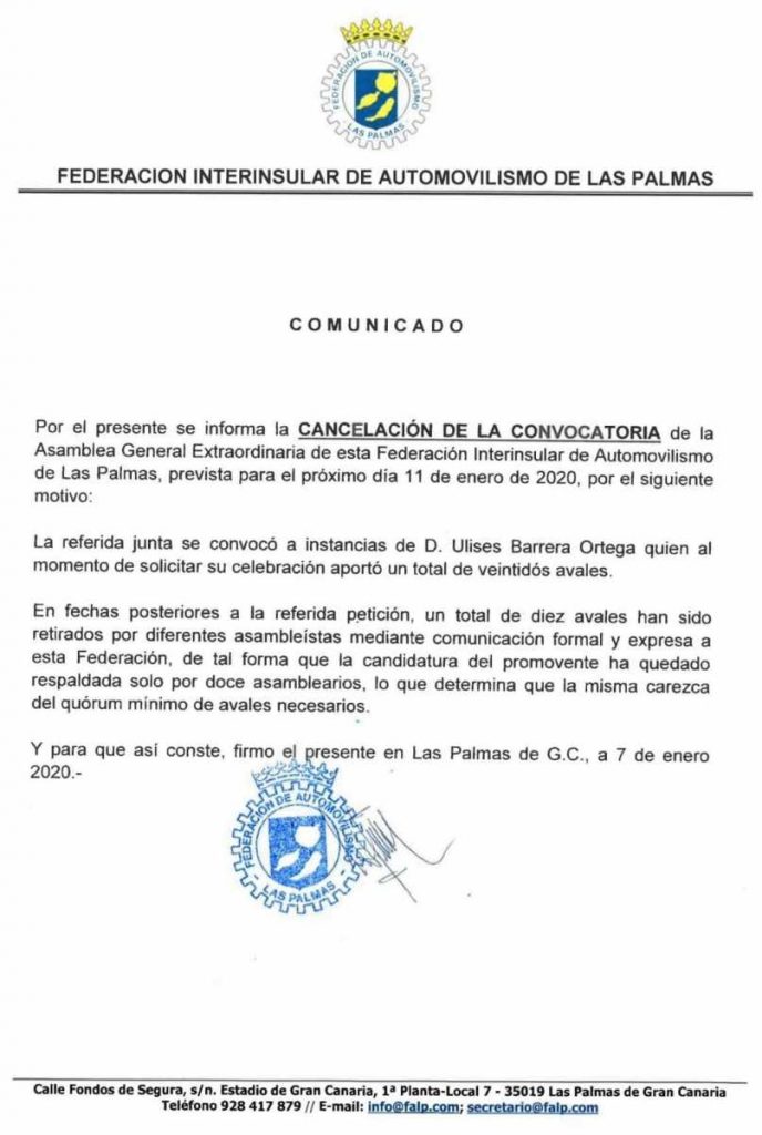 Estaba programado para este sábado la Asamblea General Extraordinaria de la Federación Insular de Las Palmas de Automovilismo, pero varios avalistas le han retirado su apoyo a Ulises Barrera, por lo que la FALP se ha visto obligada a suspender su moción de censura.