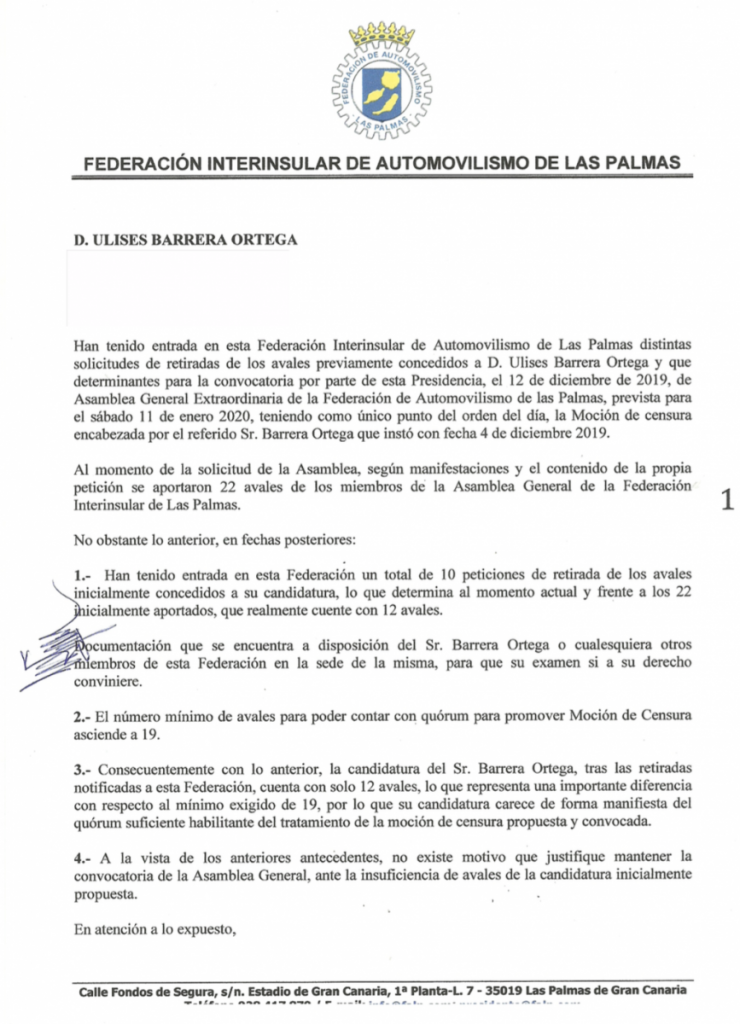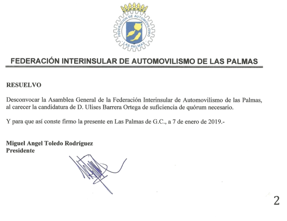 En automovilismocanario.com quisimos saber la opinión de uno de los afectados, Ulises Barrera, para que nos diera su punto de vista sobre la decisión tomada por parte de la Federación Interinsular de Automovilismo de Las Palmas de suspender la celebración prevista para este próximo sábado, 11 de enero, de la Asamblea General Extraordinaria para debatir su moción de censura contra Miguel Ángel Toledo.