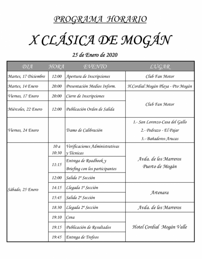 La X Clásica de Mogán se disputará, como es habitual, en una sola jornada el sábado 25 de enero, bajo la organización de Fan Motor y la colaboración principal del Ayuntamiento de Mogán y el Hotel Cordial, junto a una amplia lista de empresas colaboradoras sin las cuales no sería posible.