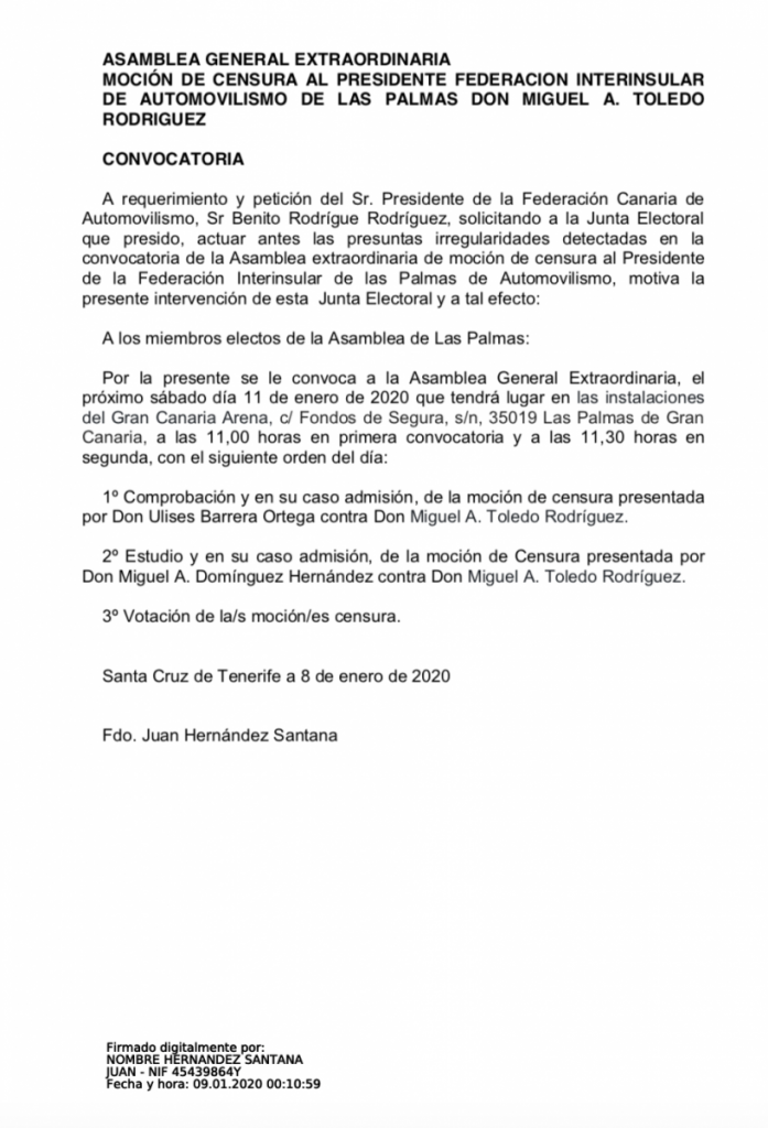 Lo adelantamos el pasado martes y se ha cumplido: la Junta Electoral de la Federación Canaria de Automovilismo ha desautorizado al presidente de la Federación Interinsular de Las Palmas de Automovilismo, Miguel Ángel Toledo, que había suspendido la Asamblea extraordinaria para debatir una moción de censura presentada por Ulises Barrera y Miguel Ángel Domínguez, por lo que finalmente sí se celebrará este sábado.