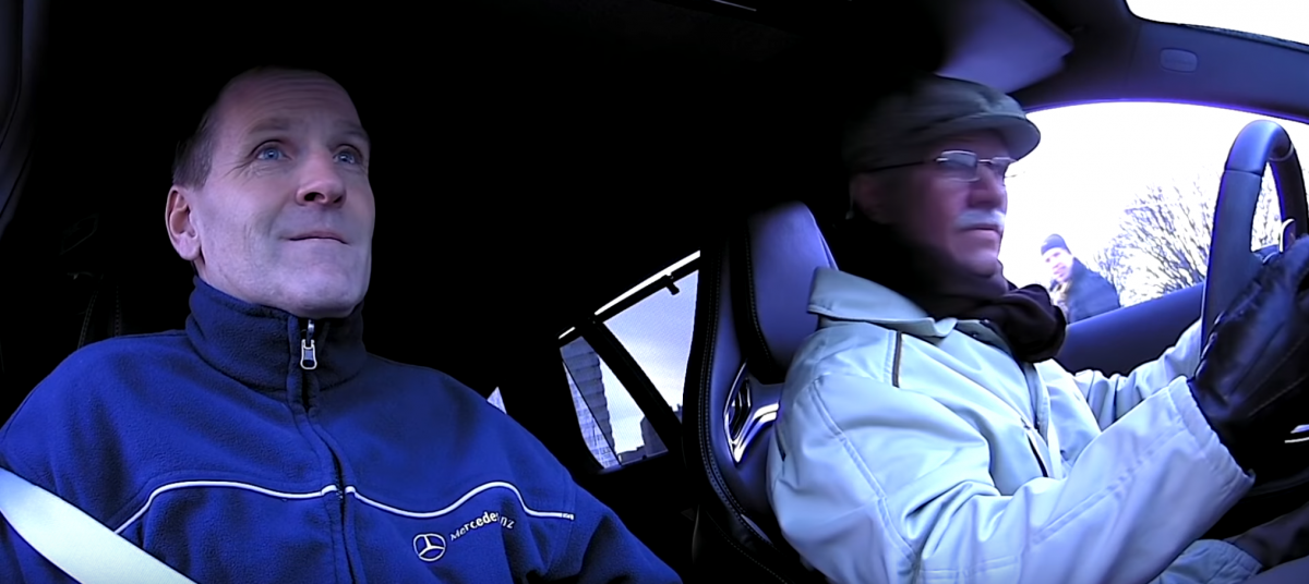 El tres veces campeón mundial de la FIA, Petter Solberg, se vistió como un anciano y se divierte con un par de empleados de Bertel O. Steen en un Mercedes AMG frente a cámaras ocultas.
