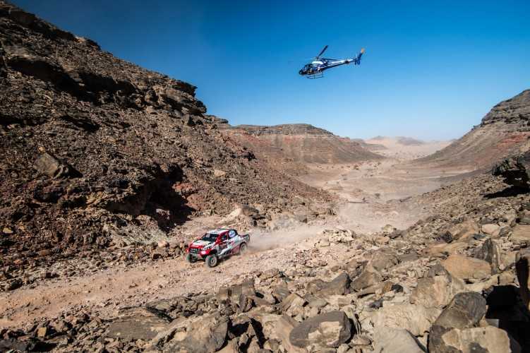 Por su parte, Bernhard ten Brinke y Tom Colsoul tuvieron una etapa algo movida después de que una piedra no solo perforara su neumático delantero derecho sino que también dañara una parte del chasis de su Toyota Hilux. Aunque perdieron algo de tiempo al cambiar el neumático y siguieron adelante con el daño estructural de su coche, fueron capaces de ser séptimos en meta, a poco más de diez minutos de los vencedores. De nuevo el Toyota Hilux Dakar demostró su fiabilidad y a pesar del problema logró llegar a meta para ser reparado, en el campamento base, por parte de los mecánicos de TOYOTA GAZOO Racing.