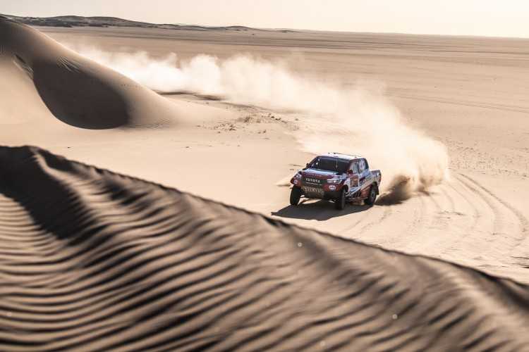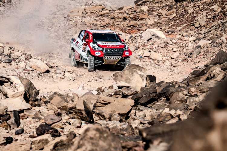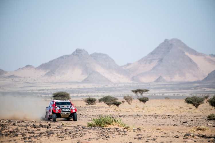 Por su parte, Bernhard ten Brinke y Tom Colsoul tuvieron una etapa algo movida después de que una piedra no solo perforara su neumático delantero derecho sino que también dañara una parte del chasis de su Toyota Hilux. Aunque perdieron algo de tiempo al cambiar el neumático y siguieron adelante con el daño estructural de su coche, fueron capaces de ser séptimos en meta, a poco más de diez minutos de los vencedores. De nuevo el Toyota Hilux Dakar demostró su fiabilidad y a pesar del problema logró llegar a meta para ser reparado, en el campamento base, por parte de los mecánicos de TOYOTA GAZOO Racing.