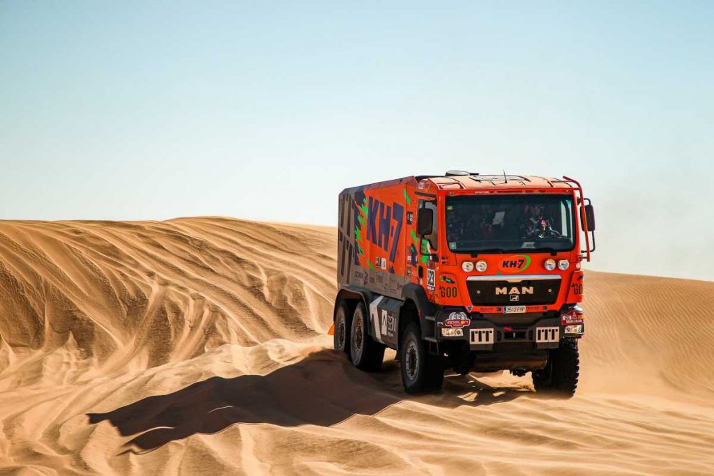 Con esos casi 900 kilómetros, la jornada era la más larga de todo el Dakar, pero la rapidez de la segunda parte de la especial, de 410 km, ha permitido a los tripulantes del MAN de tres ejes finalizar de nuevo con luz diurna, en 28ª posición, después de 5 horas y 8 minutos y medio de carrera. “La etapa tenía dos partes bien diferenciadas: una primera muy dura, con mucha piedra, que ha exigido un gran esfuerzo físico y ha comportado un importante desgaste de la máquina, y una segunda muy rápida, con dunas pequeñas, que hemos despachado a bastante velocidad”, describe el copiloto José Luis Criado.