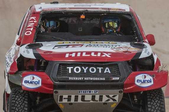 Los españoles Fernando Alonso y Marc Coma terminaron la décima etapa del Dakar con varios daños en su Toyota Hailux después de volcar en los primeros compases.
