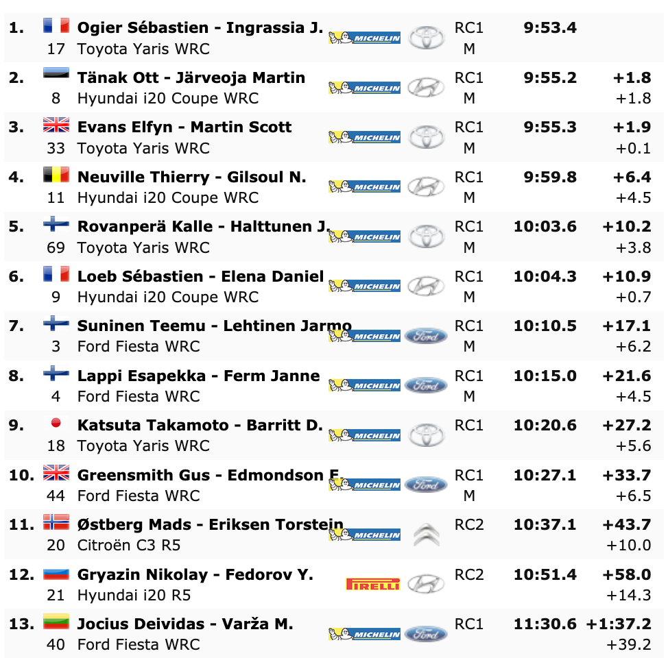 Terceros son los británicos Elfyn Evans y Scott Martin, que también estrenan montura, el Toyota Yaris WRC, quedándose a 1.9 del primer puesto, a 0.1 del segundo y superando en 4.5 a los belgas Thierry Neuville y Nicolás Gilsoul (Hyundai i20 Coupe WRC), que pierden 6.4 respecto a los líderes.