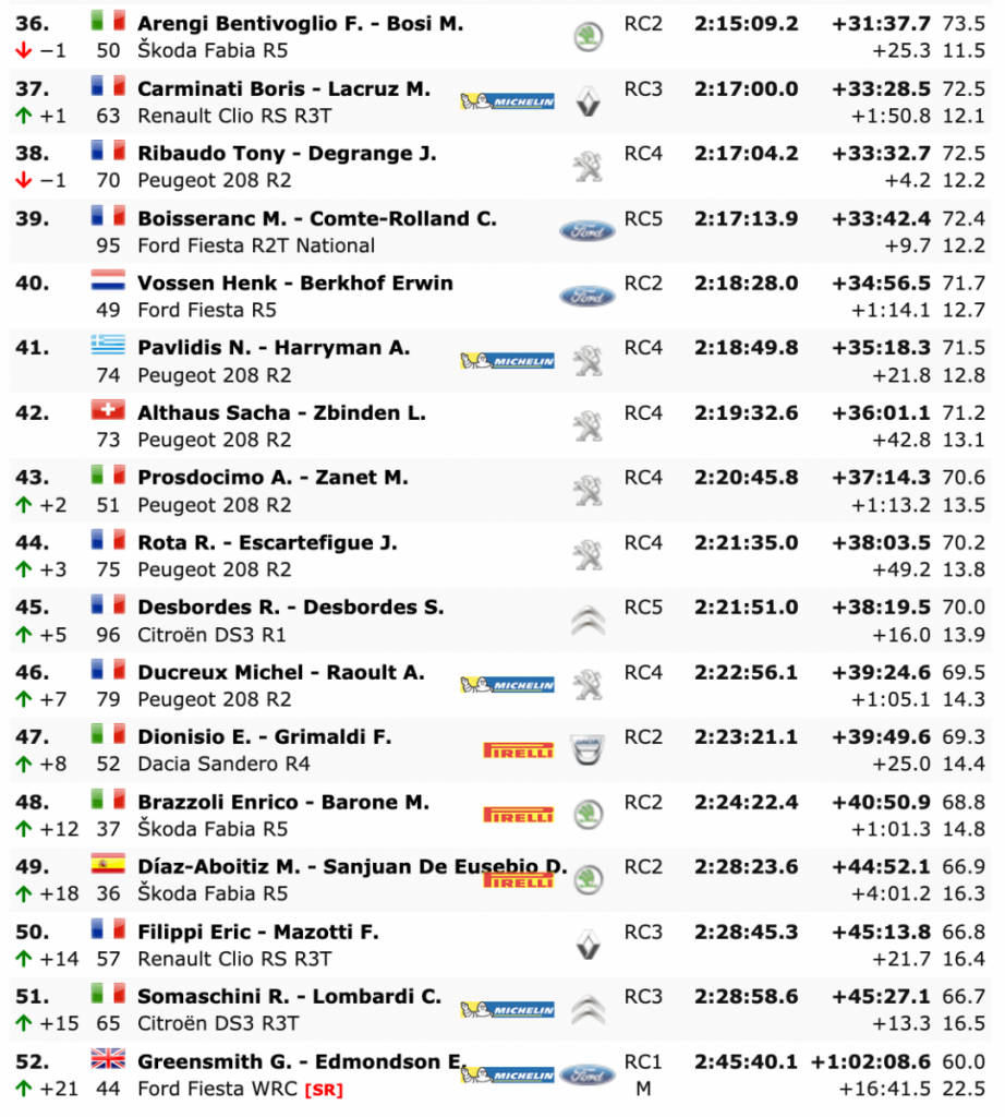 Terceros se sitúan Neuville y Gilsoul, que durmieron líderes la noche del jueves, estando a 6.4 del primer puesto y a 5.2 del segundo, pero superando en 1:00.5 al galo Sébastien Loeb y al monegasco Daniel Elena (Hyundai i20 Coupe WRC), cuartos.
