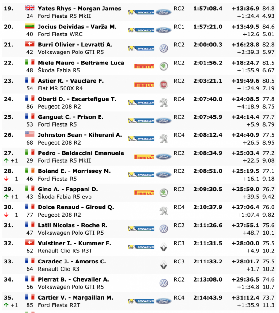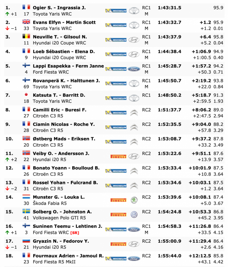 Terceros se sitúan Neuville y Gilsoul, que durmieron líderes la noche del jueves, estando a 6.4 del primer puesto y a 5.2 del segundo, pero superando en 1:00.5 al galo Sébastien Loeb y al monegasco Daniel Elena (Hyundai i20 Coupe WRC), cuartos.