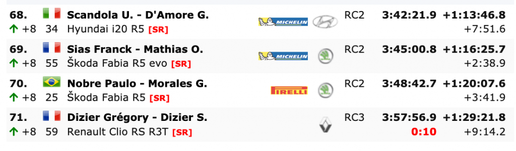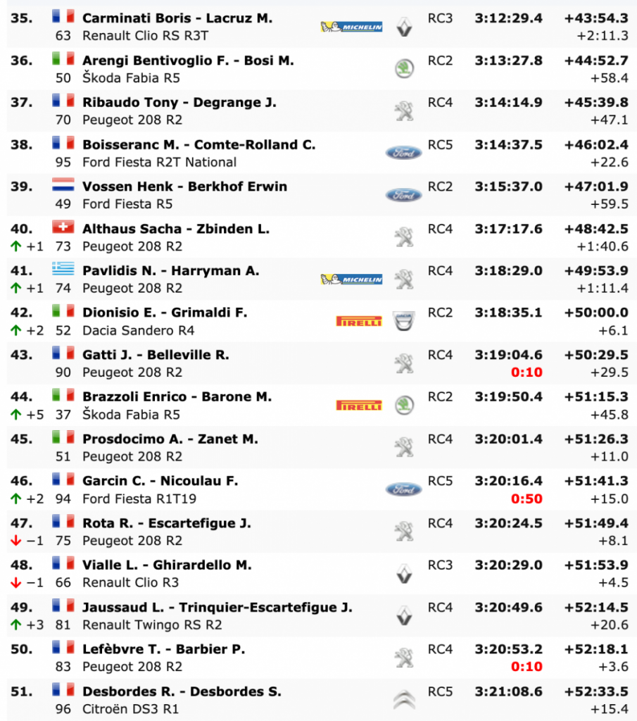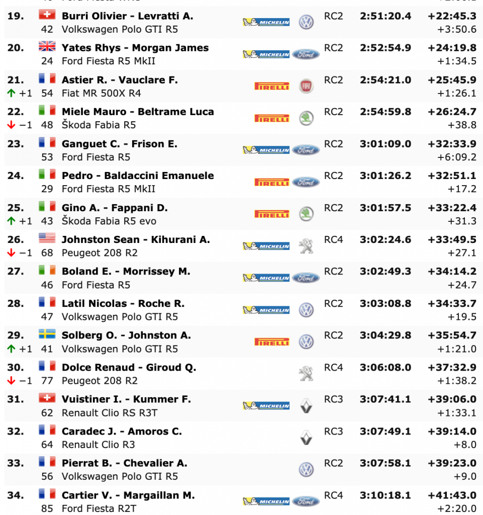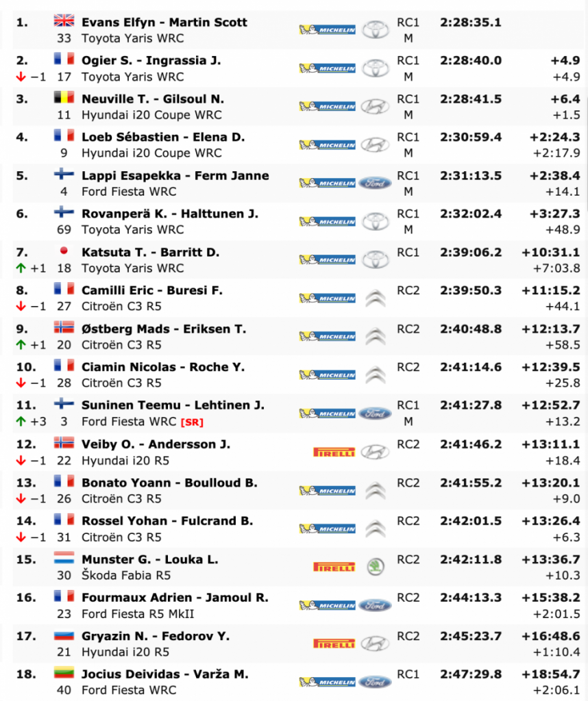 Cuartos, y mucho más alejados de los anteriores, el galo Sébastien Loeb y al monegasco Daniel Elena (Hyundai i20 Coupe WRC), que están a 2:24.3 del primer puesto y superando en 14.1 a los fineses Esapekka Lappi y Janne Ferm (Ford Fiesta WRC).
