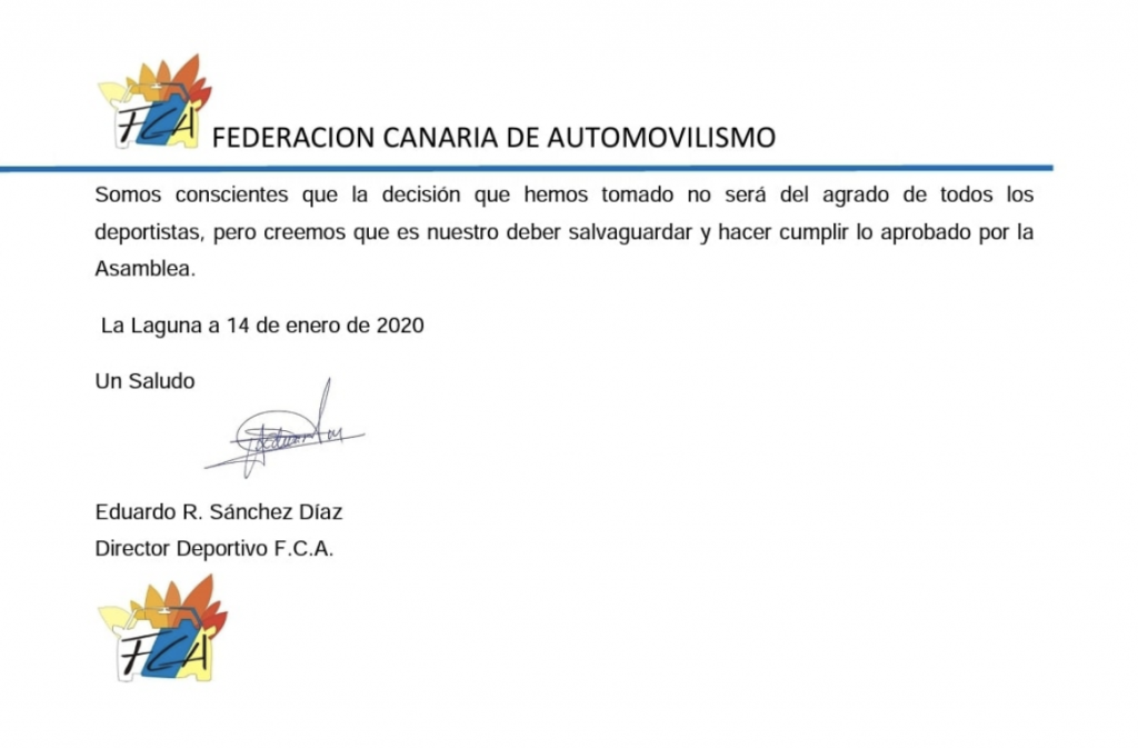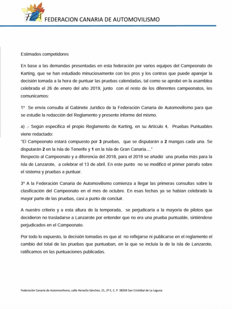 Como no escondemos nada y solemos ser trasparentes, adjuntamos pruebas y respuesta de la Federación Canaria de Automovilismo (FCA), ante tan grave error de no puntuar una prueba en la que adjuntamos una de las 8 inscripciones que tenemos, donde dice claramente CAMPEONATO DE CANARIAS 2019, ¡si señores, así mismo!