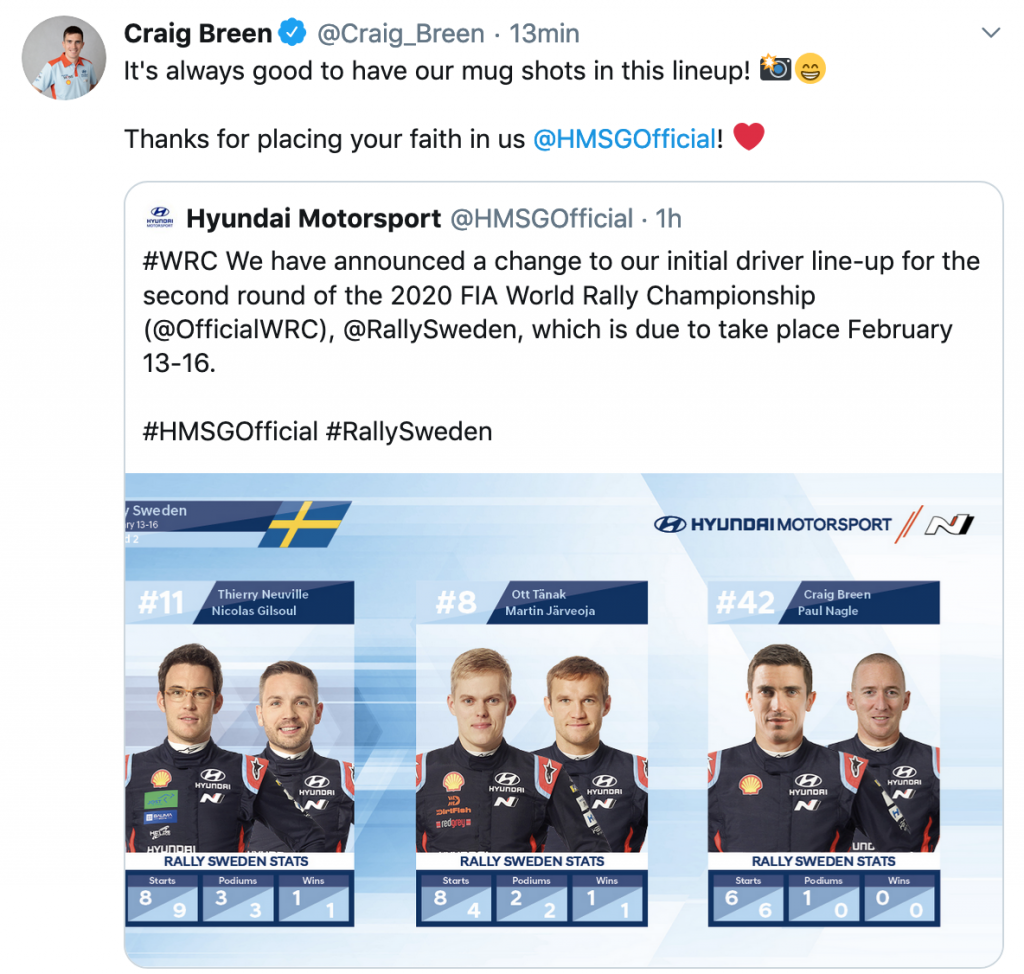 «Hemos tomado la decisión de agregar a Craig Breen a nuestra alineación para el Rally de Suecia junto con Thierry y Ott en un intento por presentar el paquete más competitivo posible para el evento con las mejores opciones disponibles para la posición en la carretera», dijo Andrea Adamo, director del equipo de Hyundai Motorsport. «Optamos por incorporar a Craig en función de su desempeño en Suecia en 2018 cuando terminó en segundo lugar, y el potencial que mostró en nuestro i20 Coupe WRC la temporada pasada», añadió.