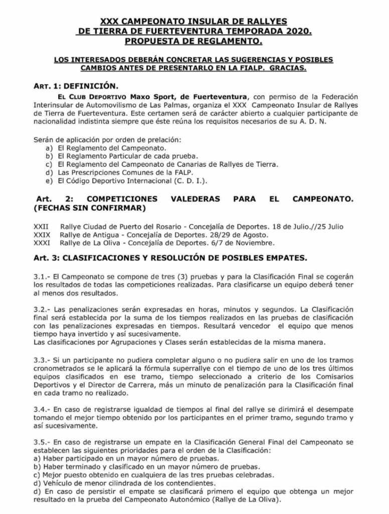 Publicamos la propuesta del reglamento del XXX Campeonato Insular de Tierra de Fuerteventura para la temporada 2020 realizada por parte del Club Deportivo Maxo Sport.