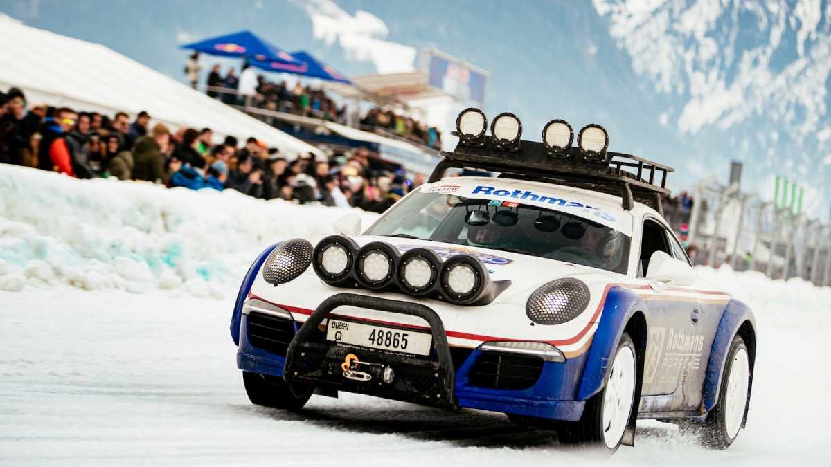 En un circuito de 600 metros de longitud construido sobre una capa de hielo de 40 centímetros de espesor, se deslizaron entre curvas varios modelos Porsche muy interesantes e históricamente significativos que, tras la carrera, entraron directamente en los libros de historia. Muchos de ellos, dentro de un entorno controlado, remolcaron a los esquiadores haciendo resurgir el arte perdido del skijöring, incluido el piloto de Le Mans Jörg Bergmeister, quien iba al volante mientras el medallista de oro olímpico de esquí Aksel Lund Svindal recorría la pista sobre sus tablas (pruebas realizadas por un piloto y un esquiador profesionales en circuito cerrado).